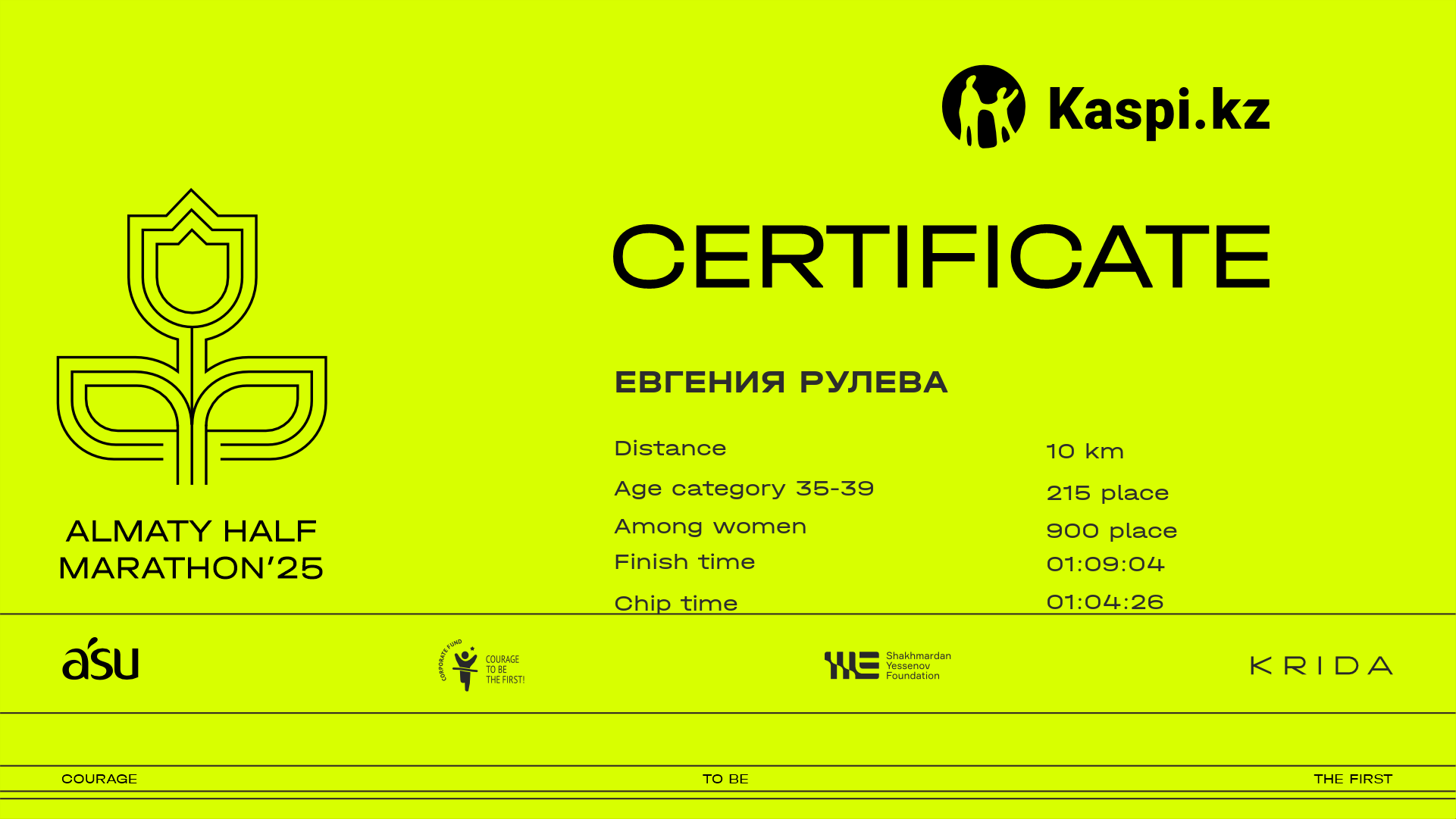| 4913 | Евгения Карагодина | ![]() | Алматы | 7283 | 01:09:34 | 01:40:53 | 01:36:23 | Download |