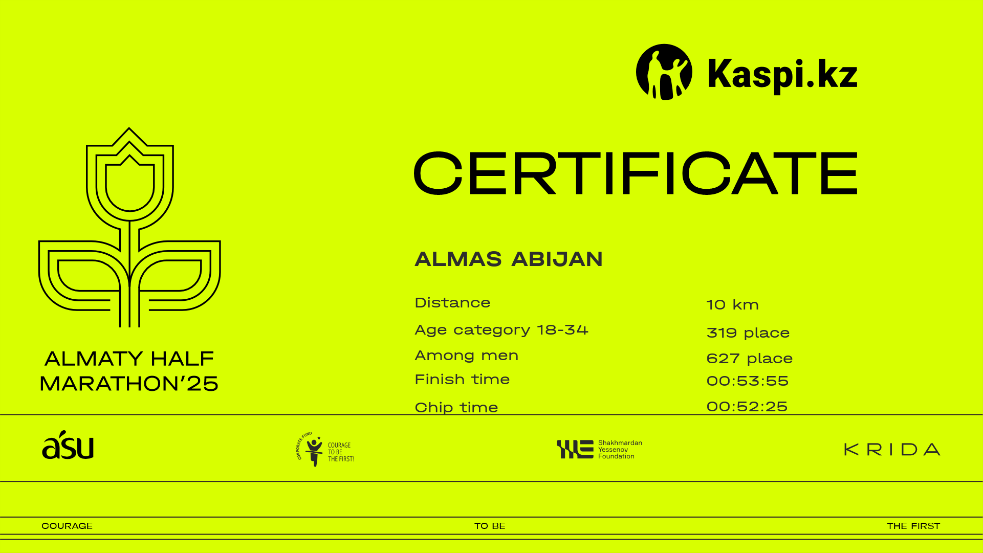| 5001 | Ramazan Akyl | ![]() | Алматы | 10013 | 01:09:08 | 01:46:21 | 01:44:40 | Download |