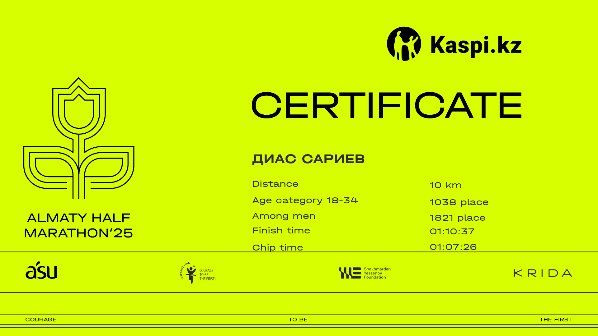 | 4716 | Aigerim Zhaniyeva | ![]() | Алматы | 7490 | 01:03:18 | 01:34:32 | 01:29:44 | Download |