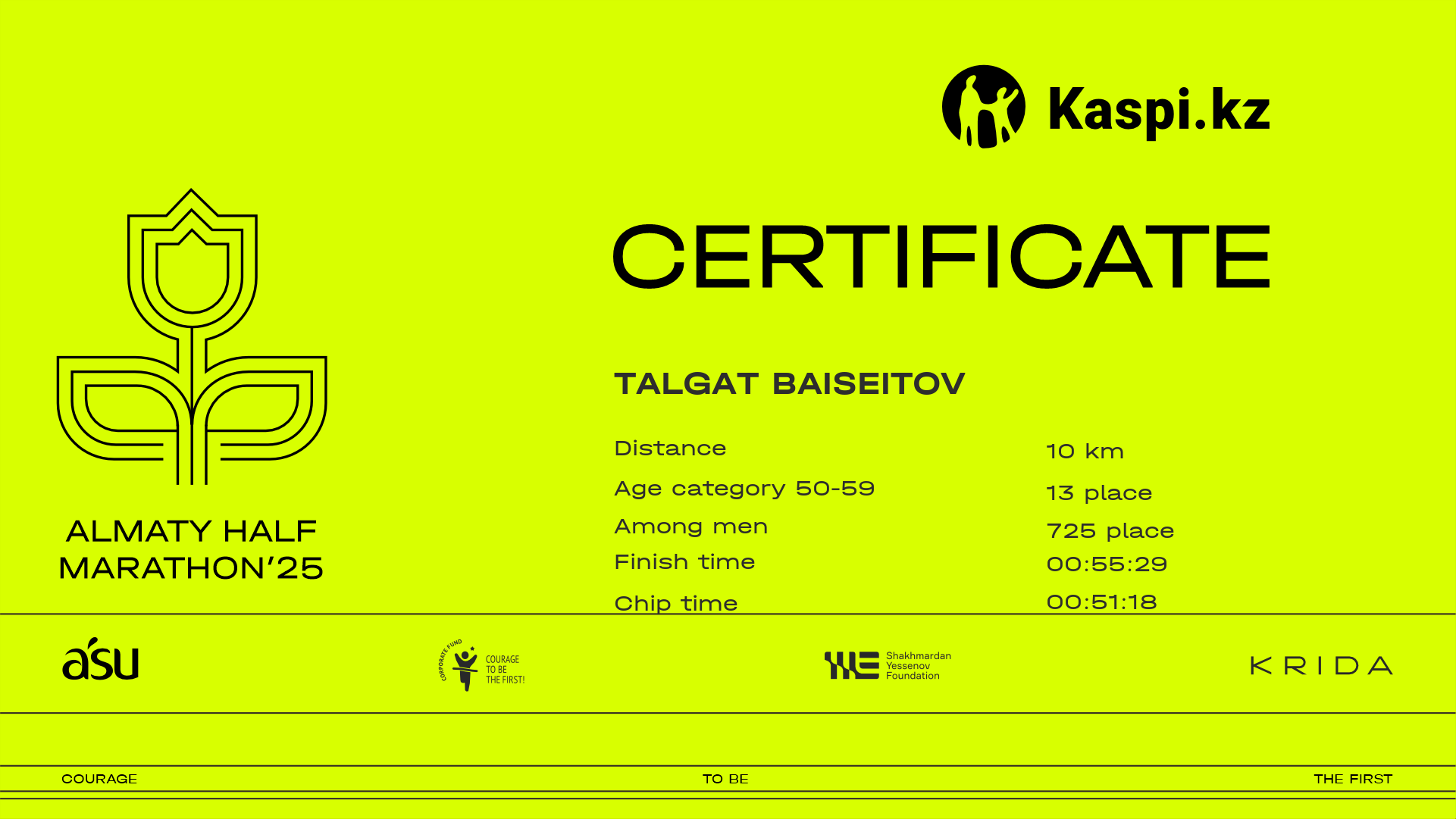 | 4887 | Tomiris Zhunussova | ![]() | Алматы | 10293 | 01:04:18 | 01:39:42 | 01:35:09 | Download |