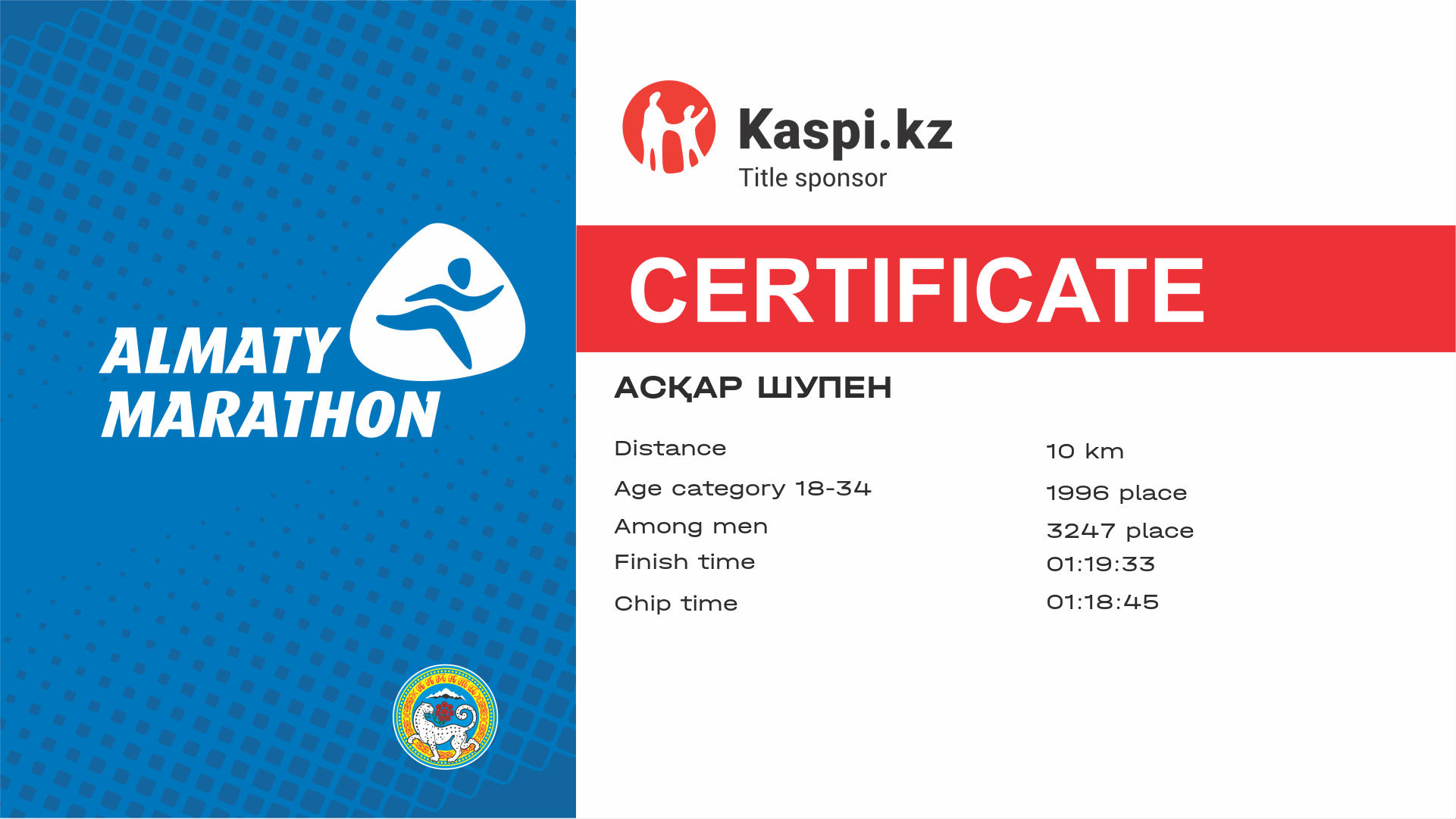 | 6826 | Нурлан Ислямов | ![]() | Алматы | 12839 | 01:15:57 | 01:45:45 | 01:45:29 | Download |