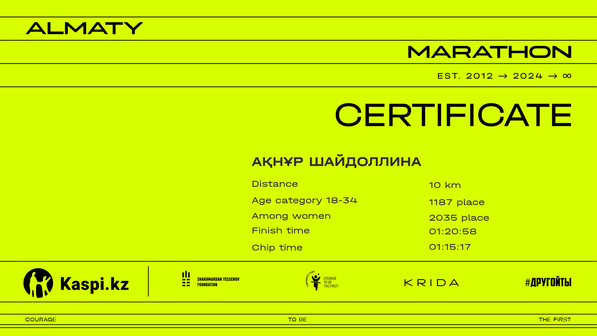 | 5348 | Айасем Кошимбай | ![]() | Алматы | 8813 | 01:11:49.30 | 01:19:50.08 | 01:18:22.63 | Download |