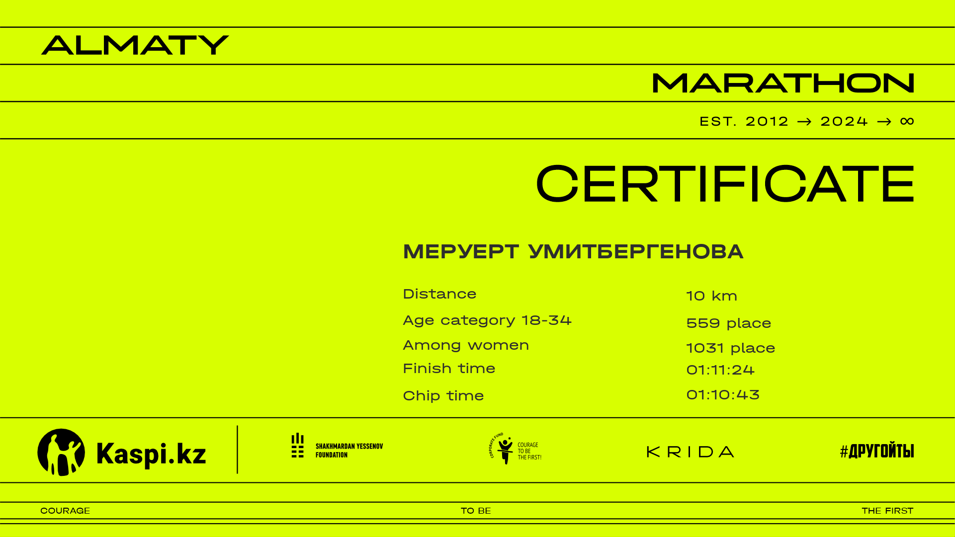 | 5242 | Меруерт Шабден | ![]() | Алматы | 13390 | 01:08:57.62 | 01:19:18.30 | 01:17:38.96 | Download |