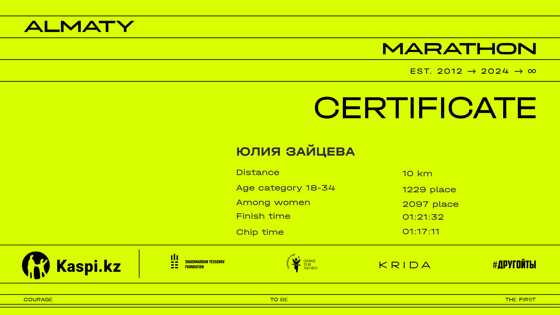 | 5652 | Юлия Зайцева | ![]() | Караганда | 9310 | 01:12:13.93 | 01:21:32.01 | 01:17:11.50 | Download |