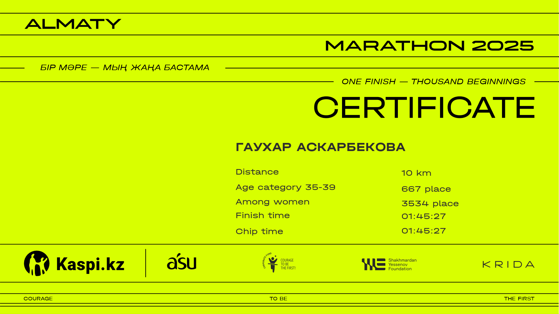 | 6763 | Аяжан Сурманова | ![]() | Алматы | 15483 | 01:31:59 | 01:46:26 | 01:43:59 | Download |