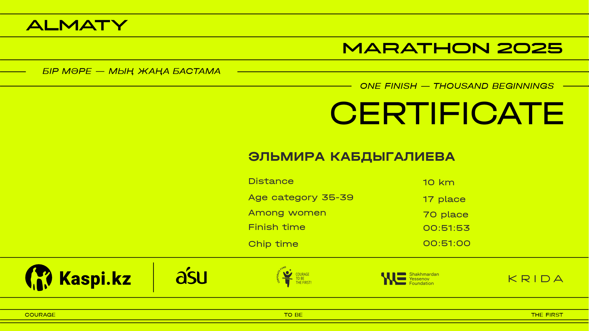 | 431 | Аскар Казиханов | ![]() | Алматы | 11250 | 00:44:35 | 00:52:29 | 00:51:06 | Download |