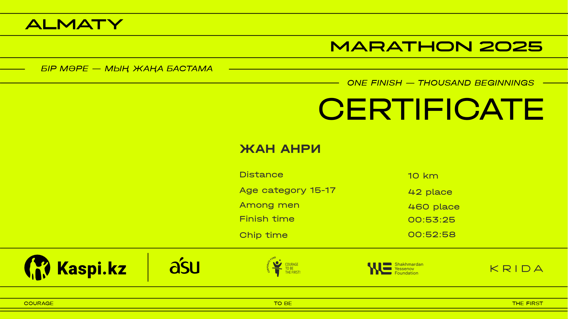 | 556 | Zhannur Zhakan | ![]() | Усть-Каменогорск | 12053 | 00:46:02 | 00:53:12 | 00:52:50 | Download |