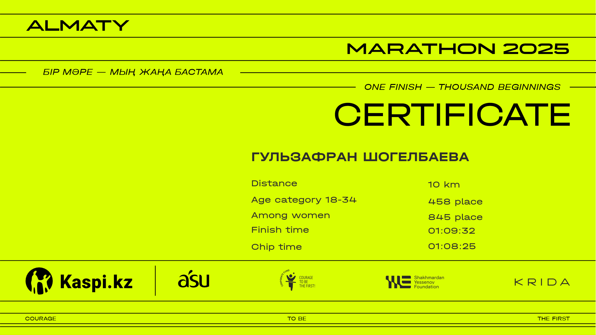 | 2797 | Aslan Yermekov | ![]() | Алматы | 7700 | 01:00:34 | 01:10:06 | 01:08:24 | Download |