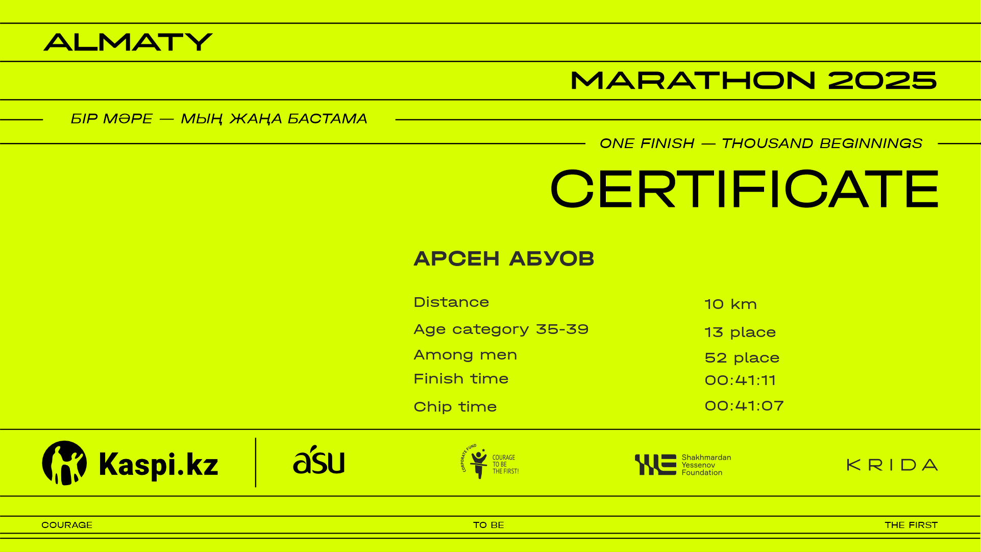 | 35 | Zhanibek Kairgeldinov | ![]() | Алматы | 11994 | 00:33:45 | 00:39:03 | 00:38:54 | Download |