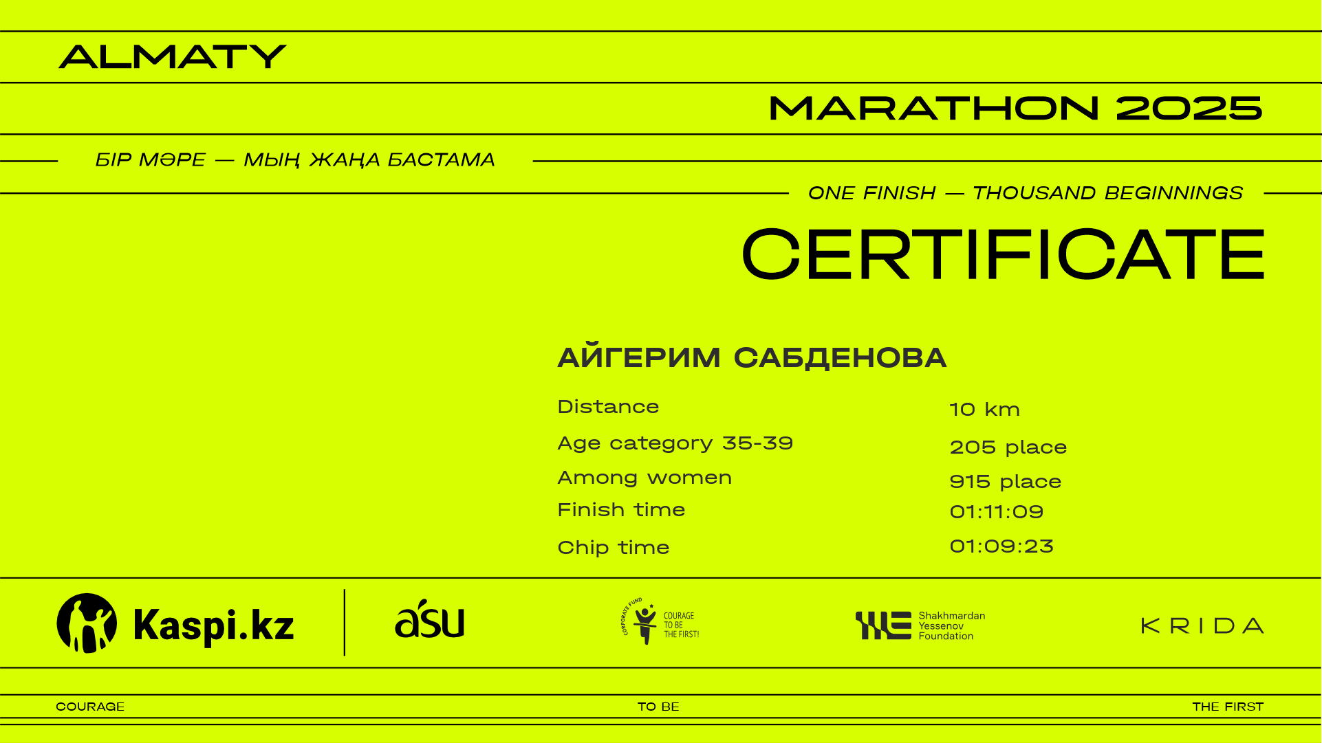 | 6126 | Анар Кобикбаева | ![]() | Алматы | 10230 | 01:20:05 | 01:34:44 | 01:31:57 | Download |