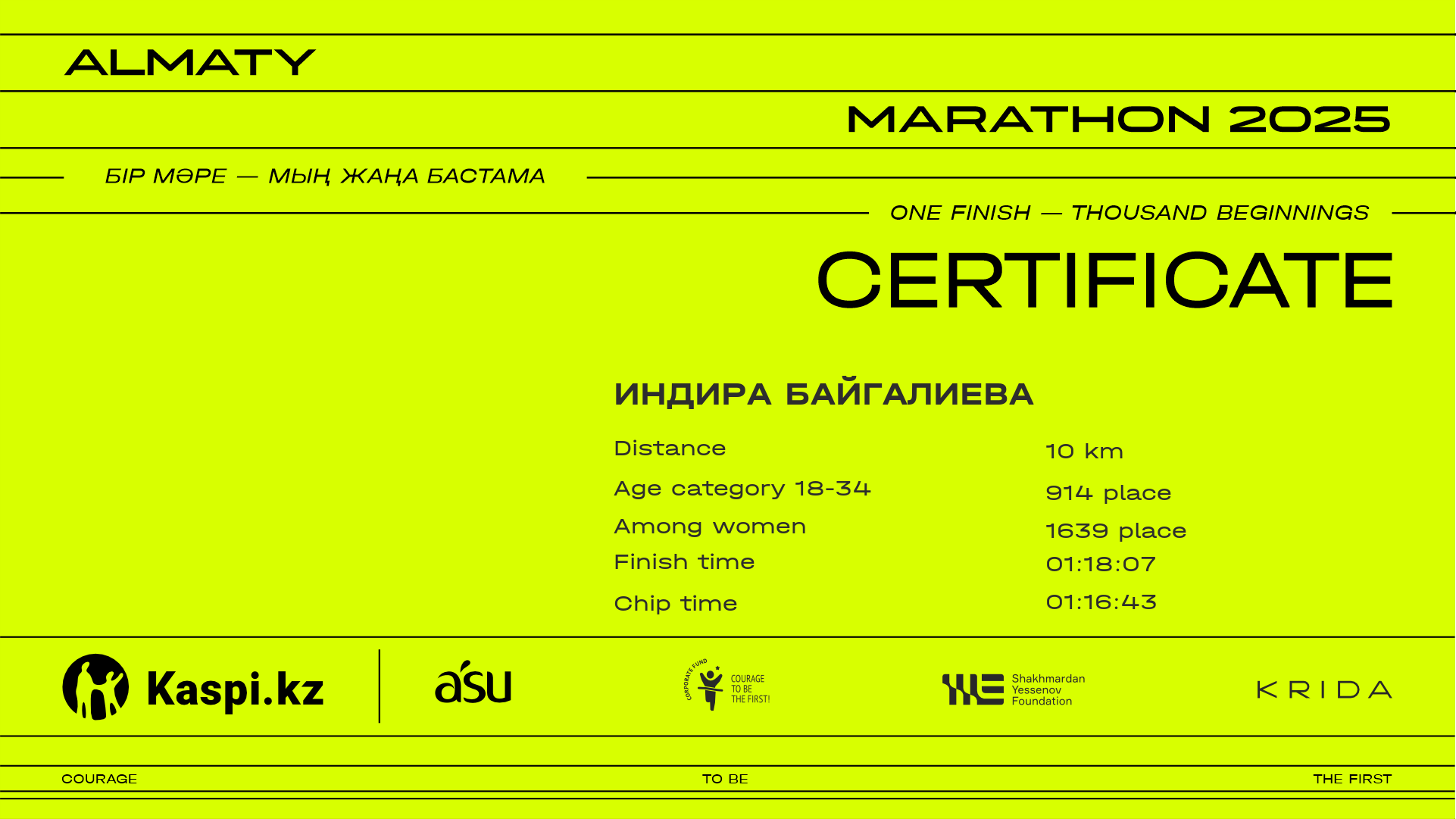 | 6708 | Индира Жунусова | ![]() | Алматы | 13614 | 01:30:03 | 01:44:23 | 01:42:19 | Download |