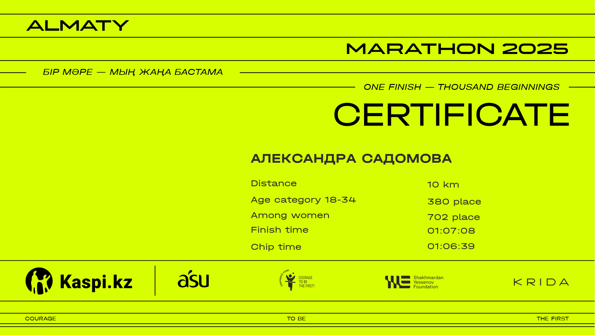 | 2501 | Алеся Зайкова | ![]() | Конаев | 11832 | 00:57:44 | 01:08:20 | 01:06:44 | Download |