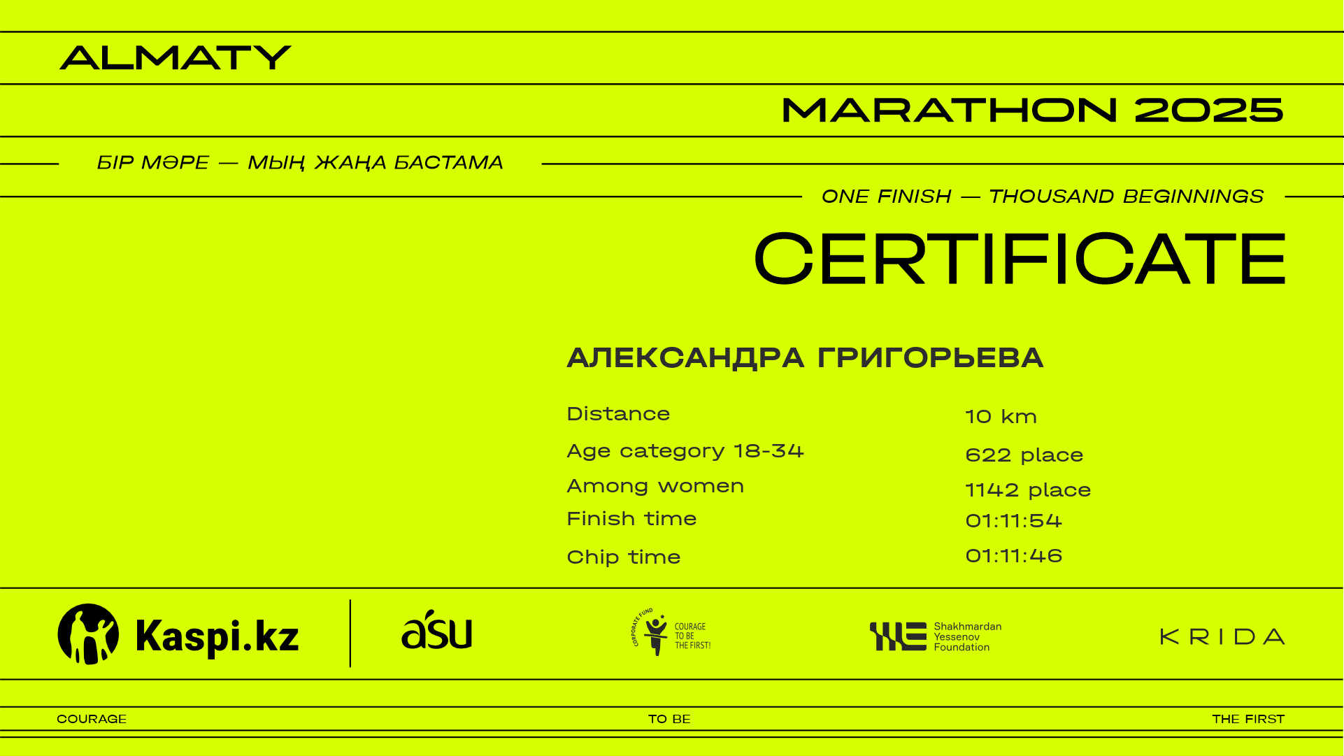 | 5970 | Назерке Ануарбек | ![]() | Алматы | 10854 | 01:18:45 | 01:32:56 | 01:30:00 | Download |