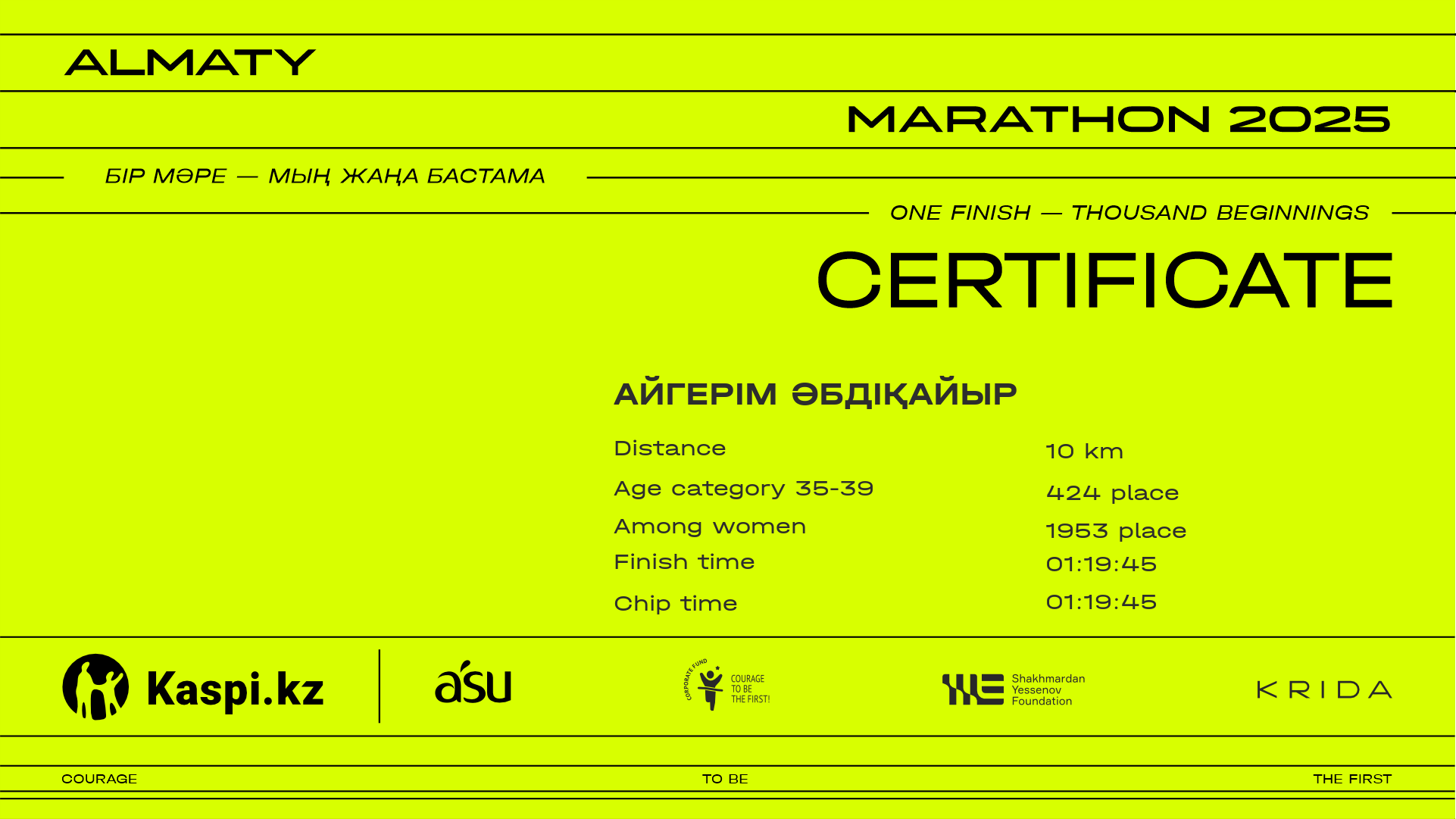 | 4791 | Сымбат Бакытханкызы | ![]() | Almaty | 15201 | 01:10:49 | 01:22:25 | 01:20:04 | Download |