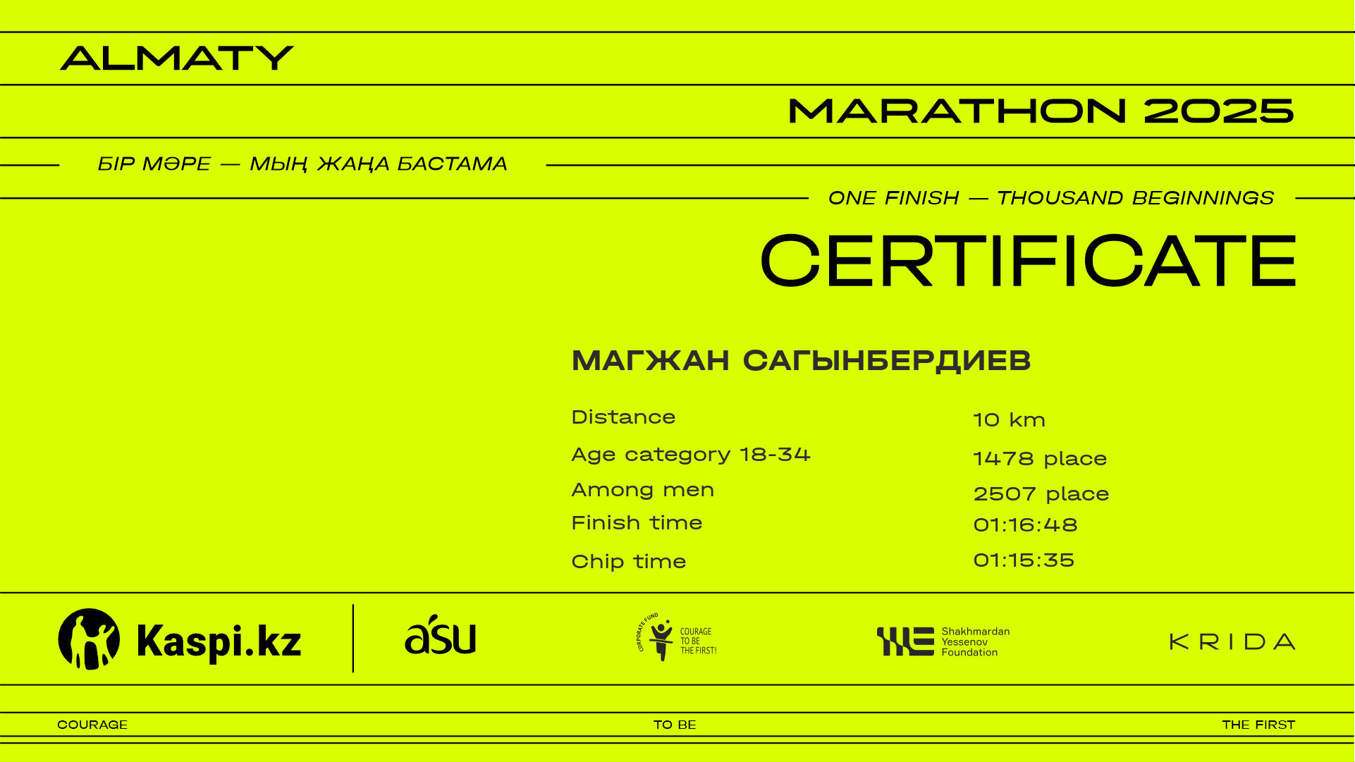 | 44 | Магжан Ахметкалиев | ![]() | Алматы | 11581 | 00:34:37 | 00:39:55 | 00:39:54 | Download |
