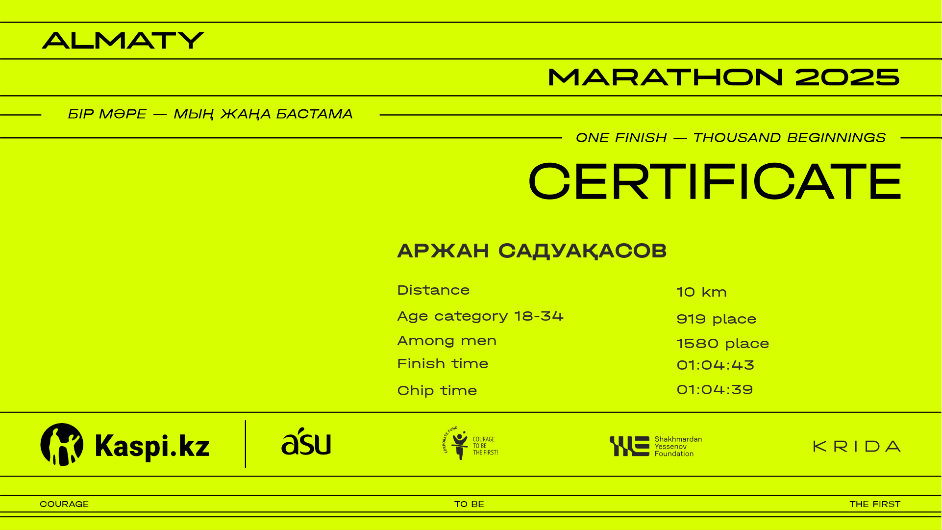 | 2174 | Medina Meirkhan | ![]() | Алматы | 13969 | 00:56:16 | 01:05:13 | 01:04:47 | Download |