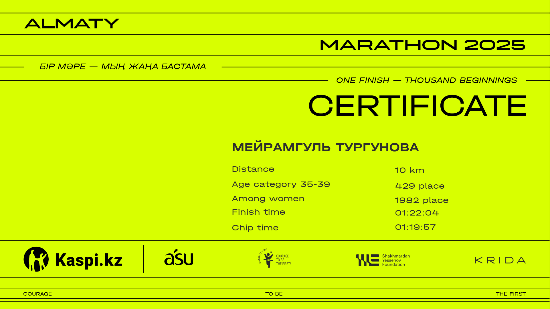 | 5039 | Мерей Елюбаева | ![]() | Алматы | 7298 | 01:11:30 | 01:23:12 | 01:21:50 | Download |