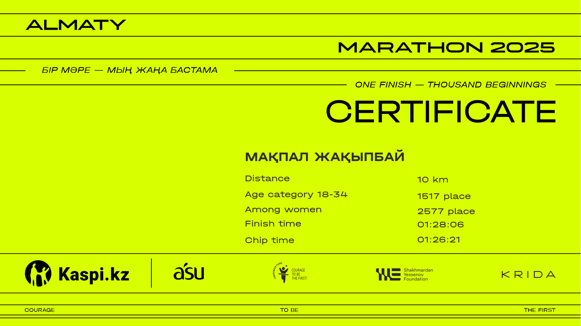 | 5788 | Жәнібек Бектұрсынұлы | ![]() | Алматы | 13480 | 01:18:15 | 01:29:37 | 01:28:01 | Download |