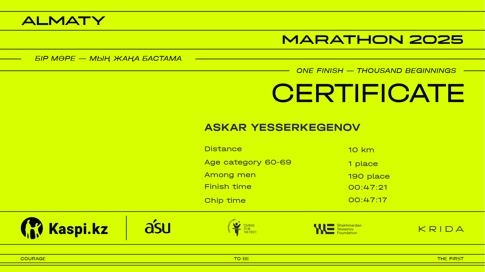 | 4865 | Yerzhan Baibatshayev | ![]() | Алматы | 13399 | 01:09:54 | 01:23:05 | 01:20:32 | Download |
