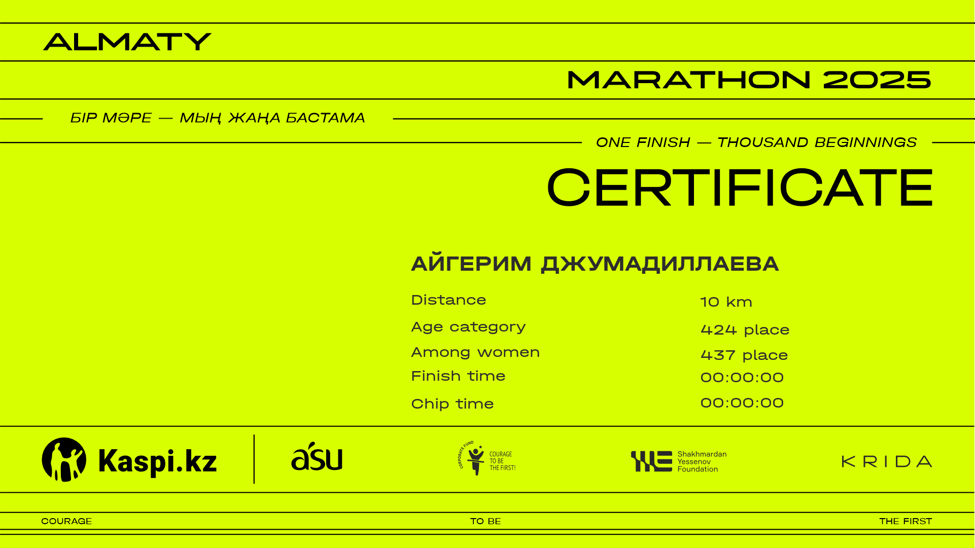 | 840 | Alina Seichanova | ![]() | Астана | 6063 | 00:48:20 | 00:57:03 | 00:55:41 | Download |