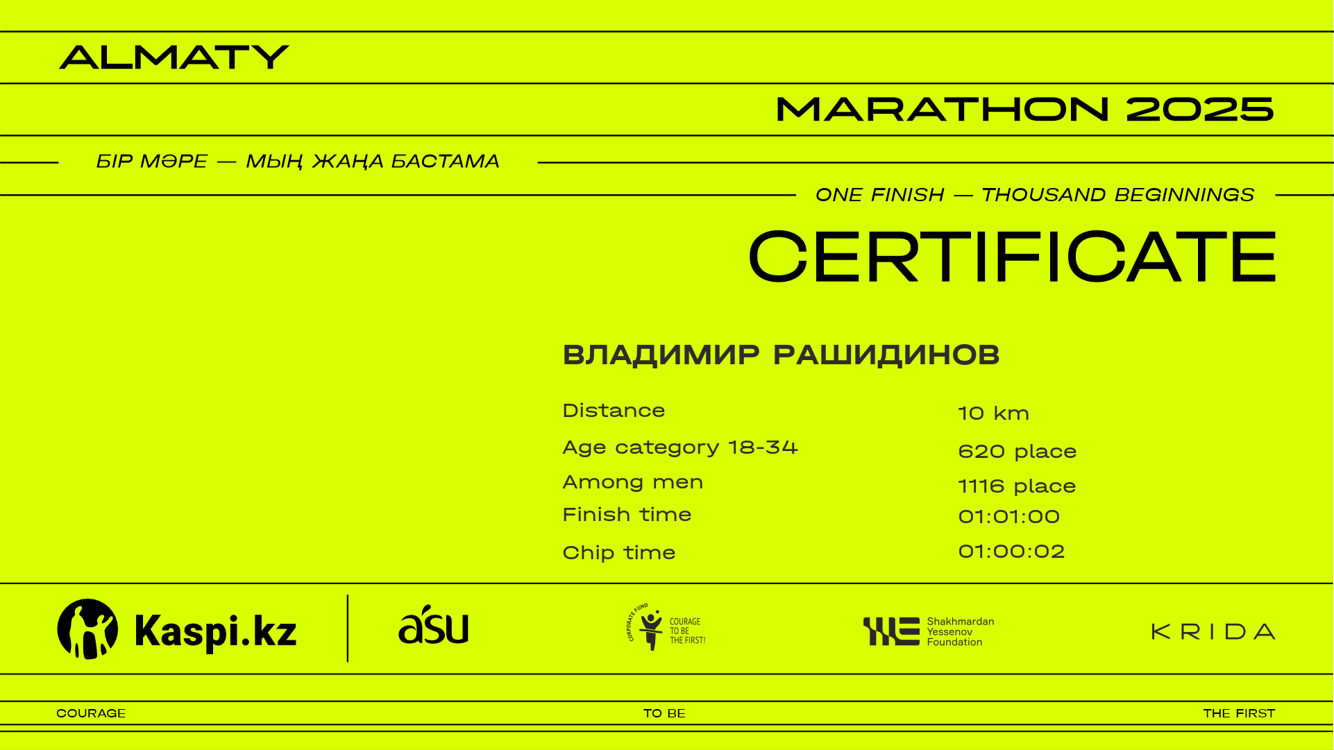 | 1432 | Владимир Рашидинов | ![]() | Алматы | 11542 | 00:53:31 | 01:01:00 | 01:00:02 | Download |
