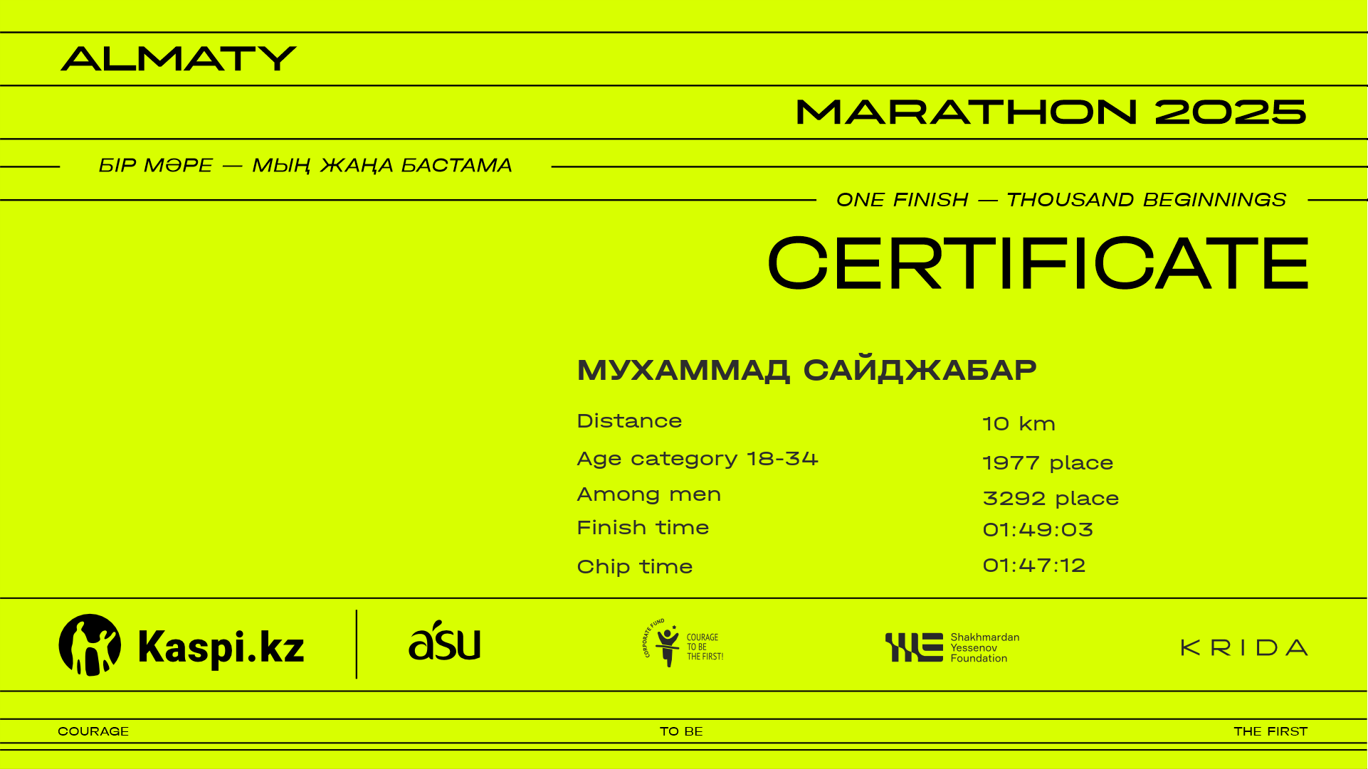 | 6849 | Мухаммад Сайджабар | ![]() | Алматы | 9278 | 01:34:30 | 01:49:03 | 01:47:12 | Download |
