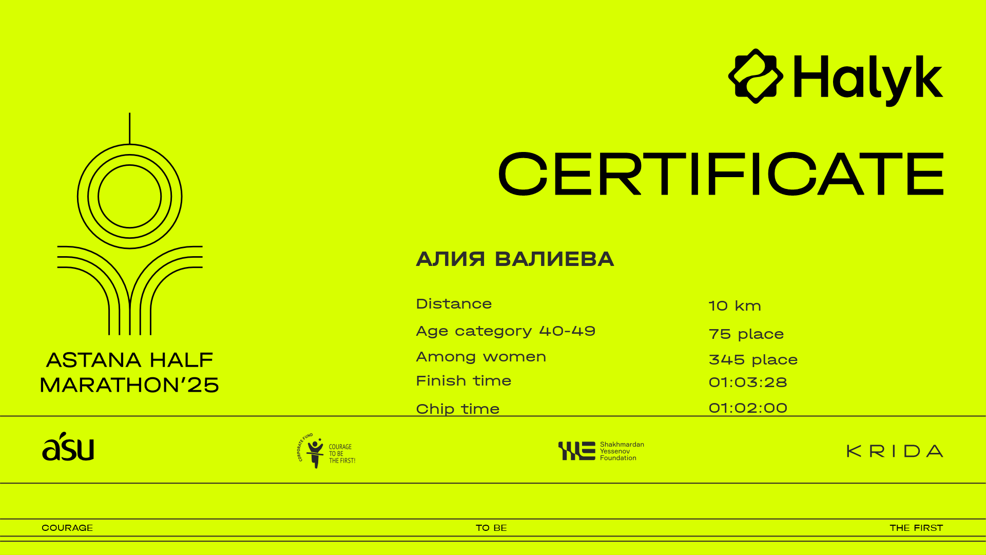 | 3594 | Валентина Бердалина | ![]() | Астана | 3317 | 00:53:05 | 01:33:17 | 01:31:03 | Download |