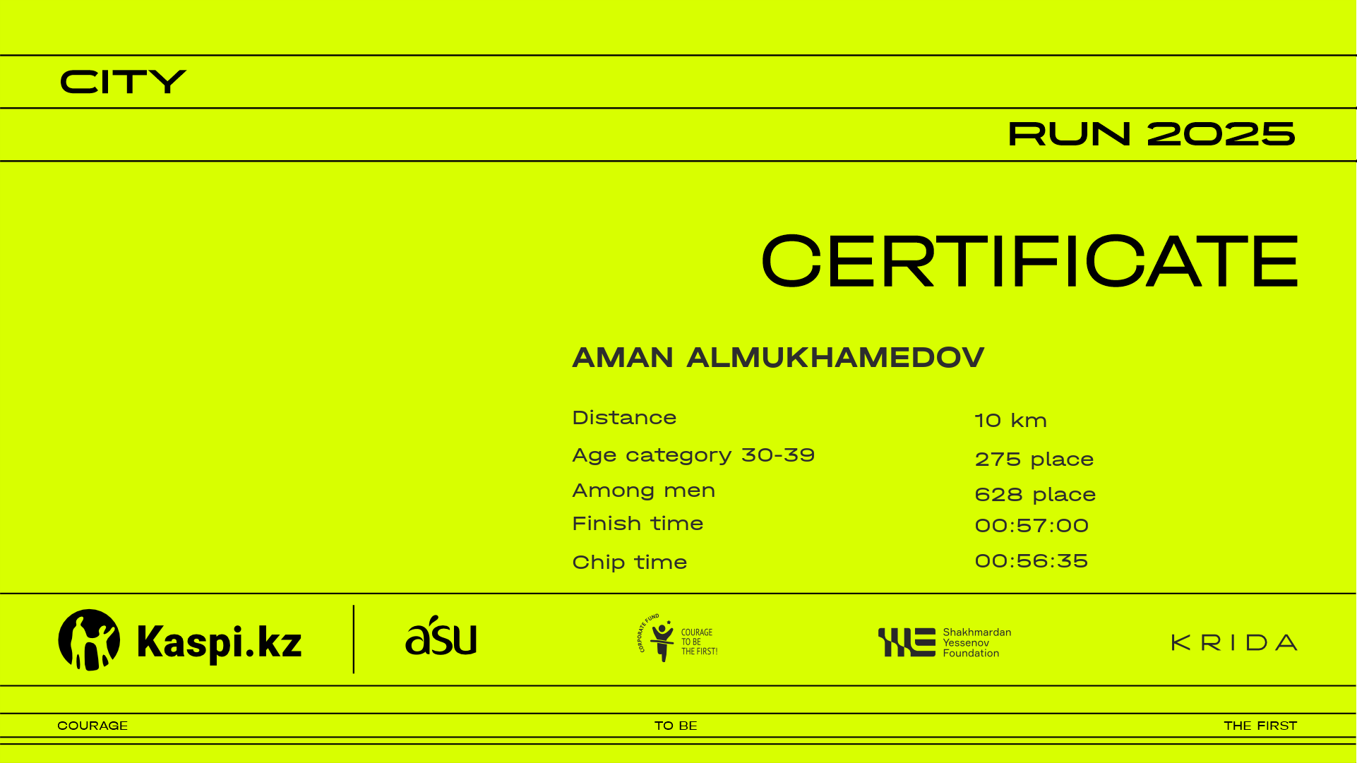 | 681 | Alikhan Nurpeiissov | ![]() | Almaty | 995 | 00:15:16 | 00:25:11 | 00:35:58 | 00:46:17 | 00:54:08 | 00:55:12 | 00:54:41 | Download |