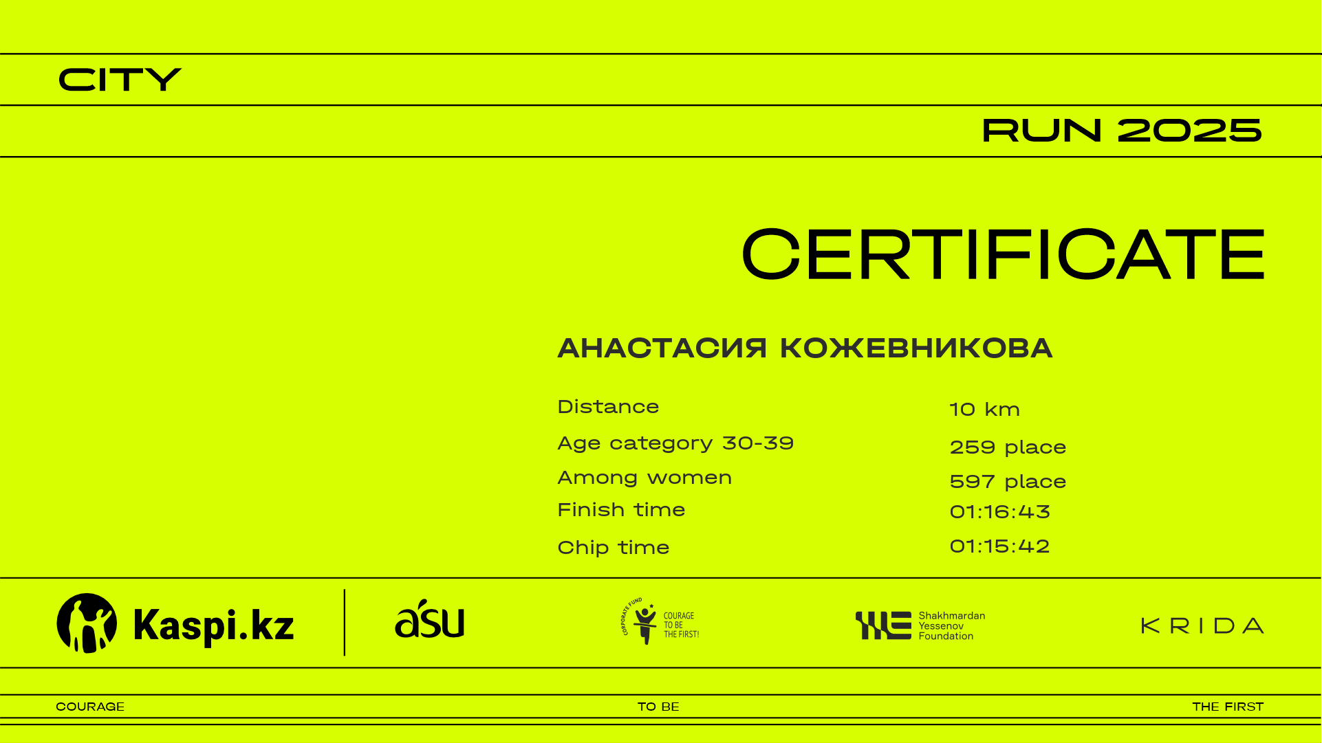| 1813 | Лаура Жомартова | ![]() | Алматы | 380 | 00:21:03 | 00:36:31 | 00:52:17 | 01:09:17 | 01:22:22 | 01:24:13 | 01:23:03 | Download |
