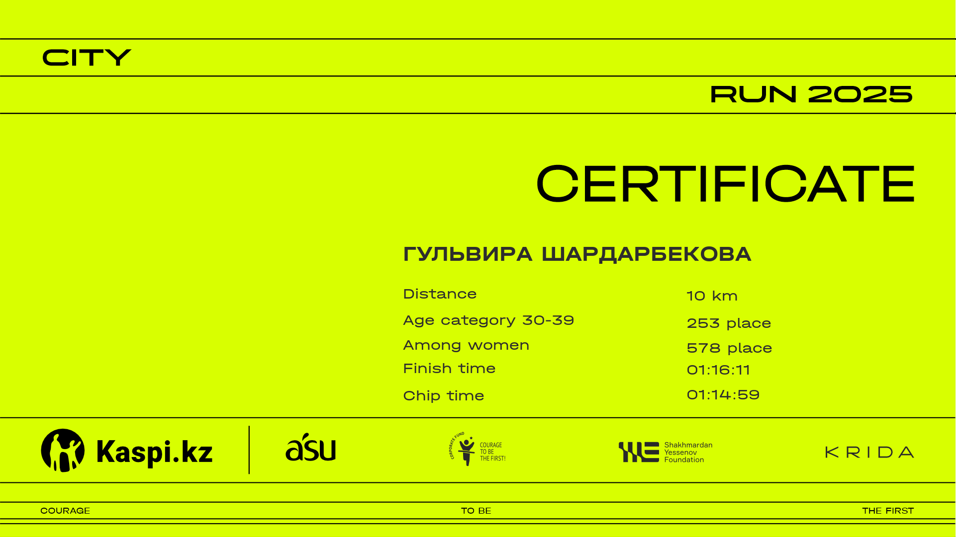 | 1836 | Сания Сертаева | ![]() | Алматы | 72 | 00:20:41 | 00:33:57 | 00:52:25 | 01:11:01 | 01:24:17 | 01:25:55 | 01:24:46 | Download |