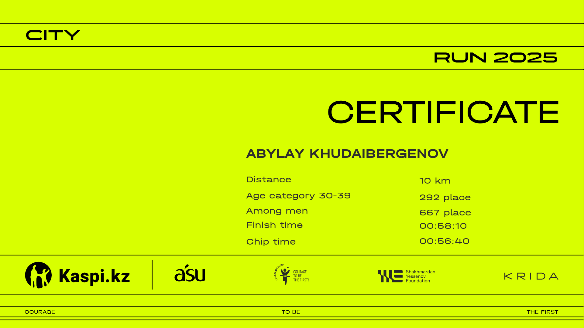 | 1062 | Aidos Abdildayev | ![]() | Almaty | 1634 | 00:15:53 | 00:26:46 | 00:38:23 | 00:51:12 | 01:00:33 | 01:02:01 | 01:01:36 | Download |