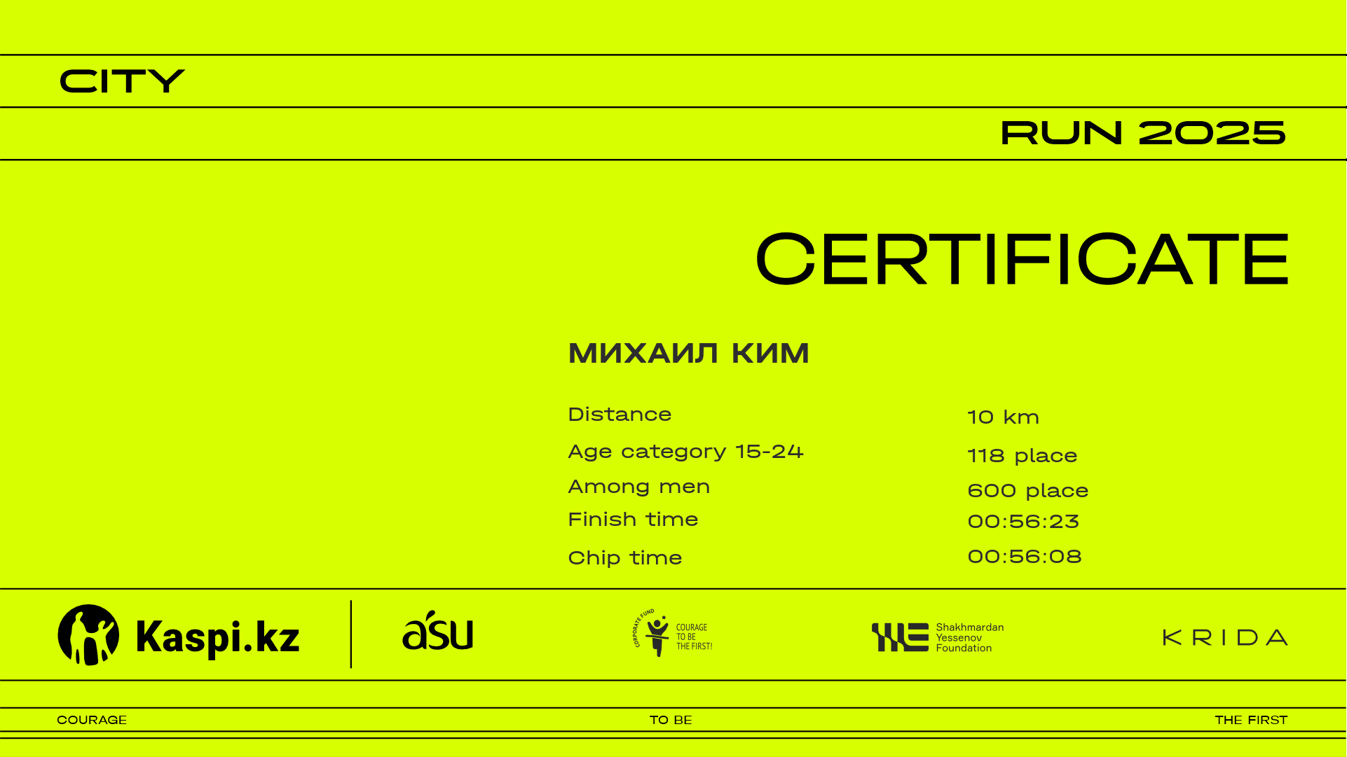 | 1863 | Amina Alisheva | ![]() | Алматы | 2510 | 00:23:53 | 00:39:02 | 00:55:53 | 01:13:18 | 01:26:55 | 01:28:40 | 01:27:21 | Download |