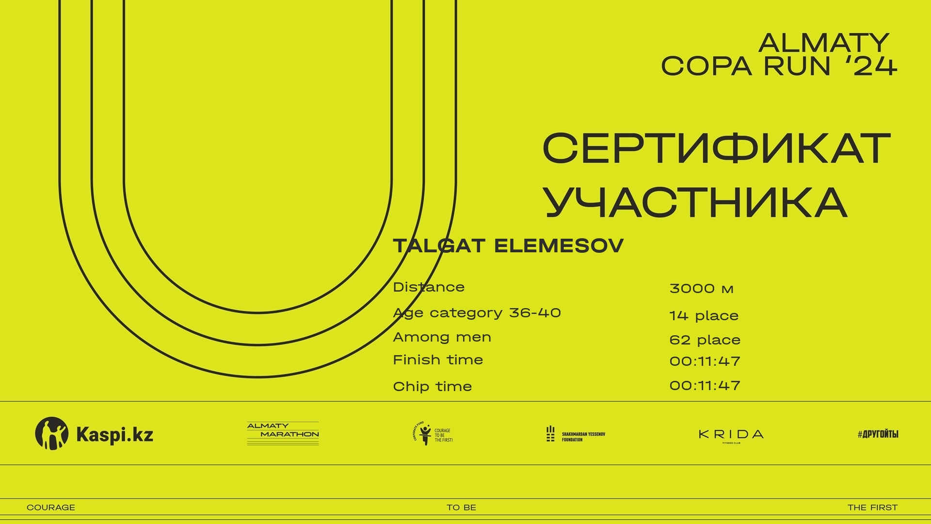 | Place | Participant | Citizenship | City | Bib | Finish | Certificate |