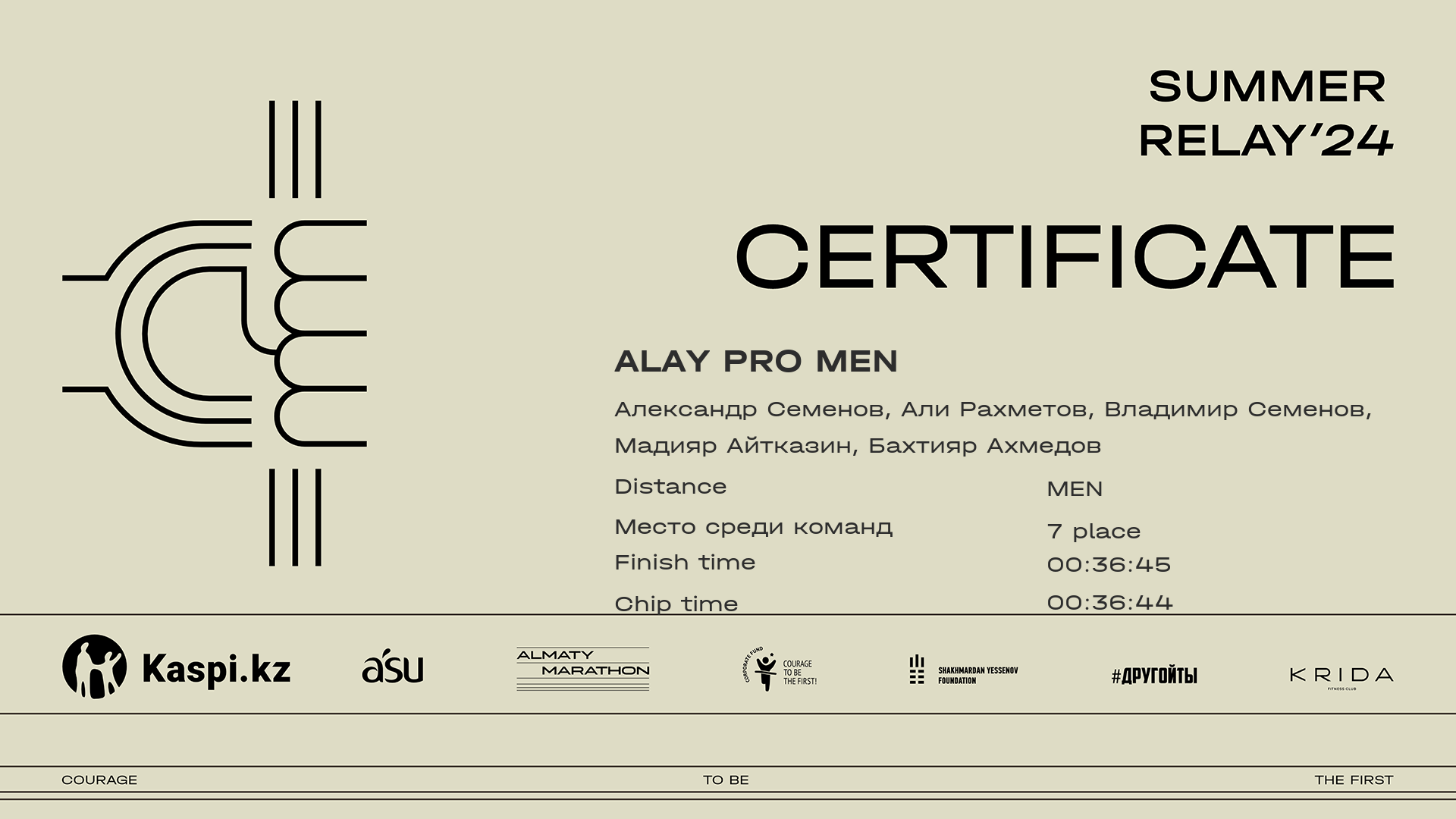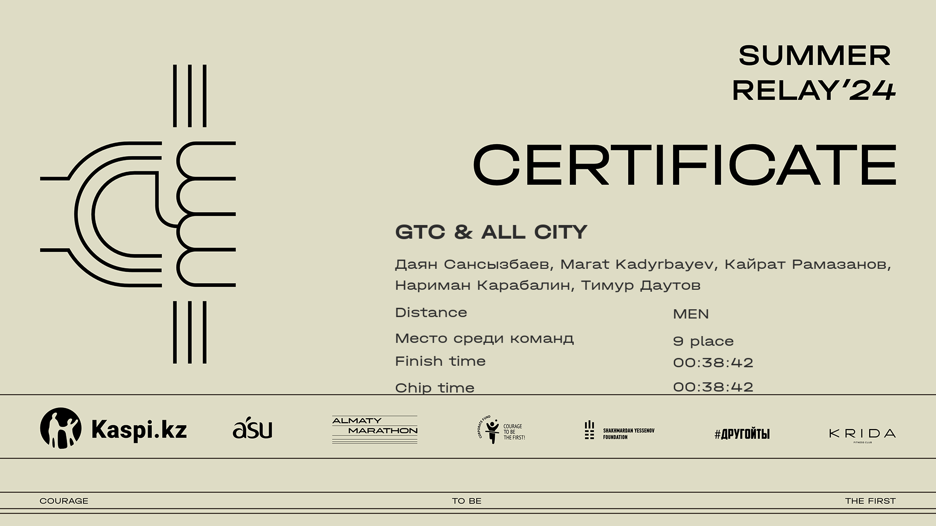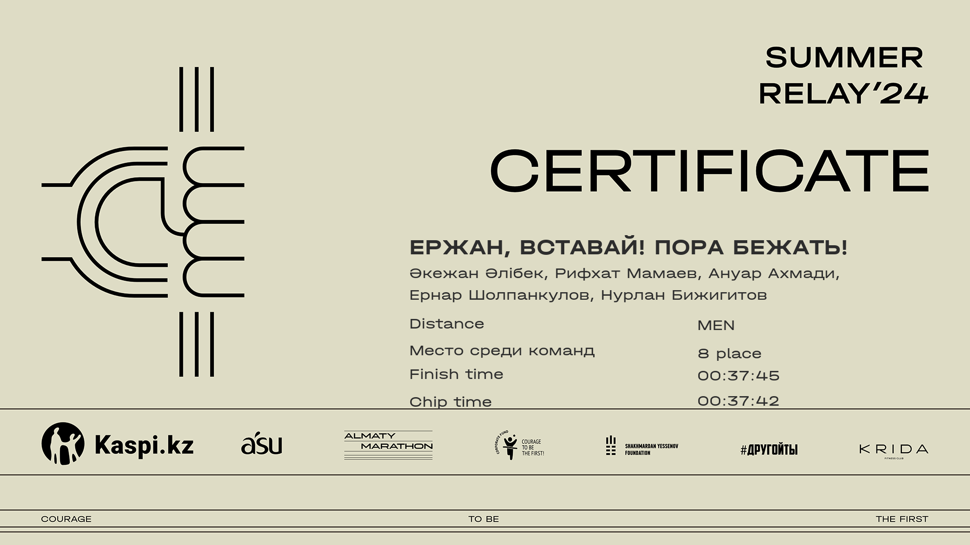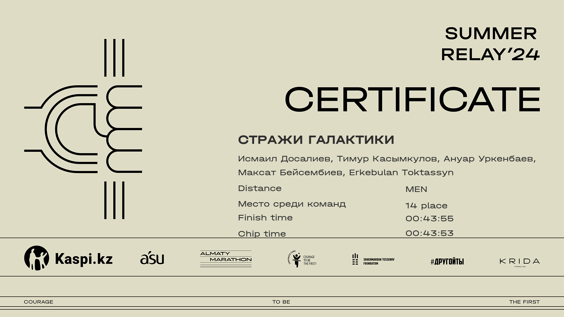 | 20 | Kaspi Run: Aleksandr Solodun, Almurat Zhilkamanov, Берик Кожамжаров, Арман Букенов, Руслан Дубинин |  | Алматы | 15 | 00:09:37.69 | 00:08:30.88 | 00:11:45.45 | 00:09:39.13 | 00:47:37.89 | 00:47:35.83 | Download |