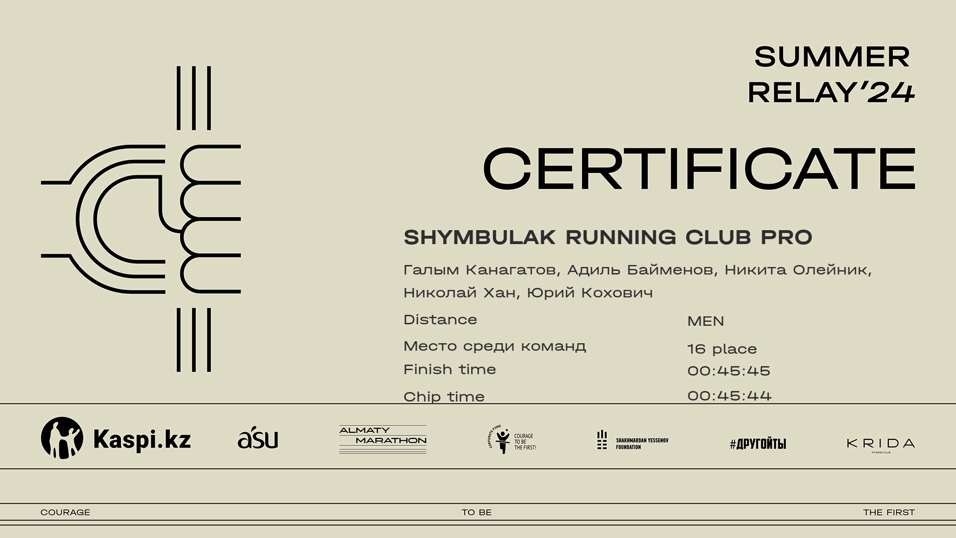 | 16 | Shymbulak Running Club PRO: Галым Канагатов, Адиль Байменов, Никита Олейник, Николай Хан, Юрий Кохович |  | Алматы | 18 | 00:09:03.35 | 00:09:38.99 | 00:09:46.51 | 00:08:38.10 | 00:45:45.62 | 00:45:44.07 | Download |