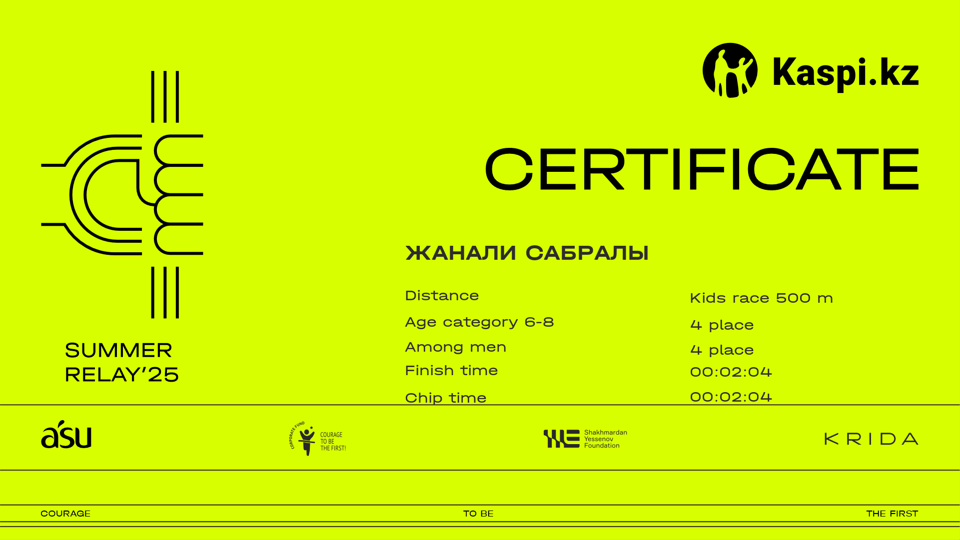 | 5 | Жанали Сабралы | ![]() | Almaty | 132 | 00:02:04.80 | 00:02:04.80 | Download |