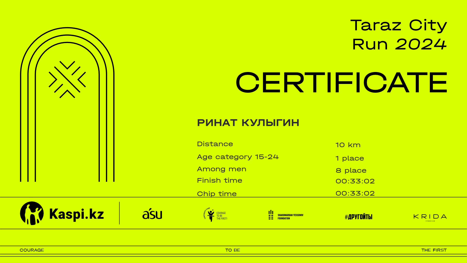 | 12 | Даулет Рахимбаев | ![]() | Алматы | 438 | 00:08:09.10 | 00:16:34.60 | 00:25:14.70 | 00:33:55.40 | 00:33:54.10 | Download |