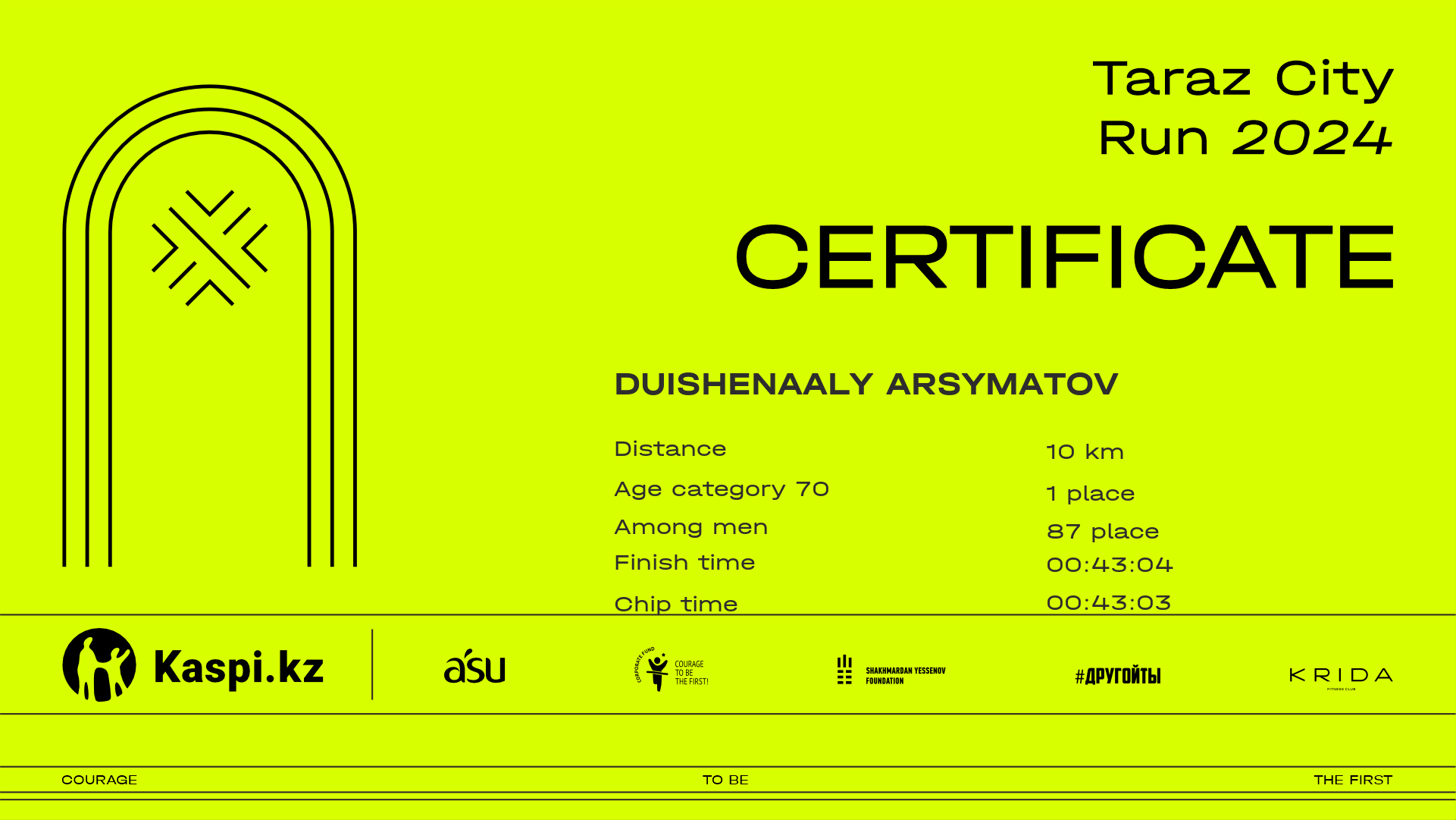 | 101 | Даулет Суинтаев | ![]() | Шымкент | 35 | 00:11:22.10 | 00:22:16.90 | 00:33:04.60 | 00:43:38.10 | 00:43:24.40 | Download |