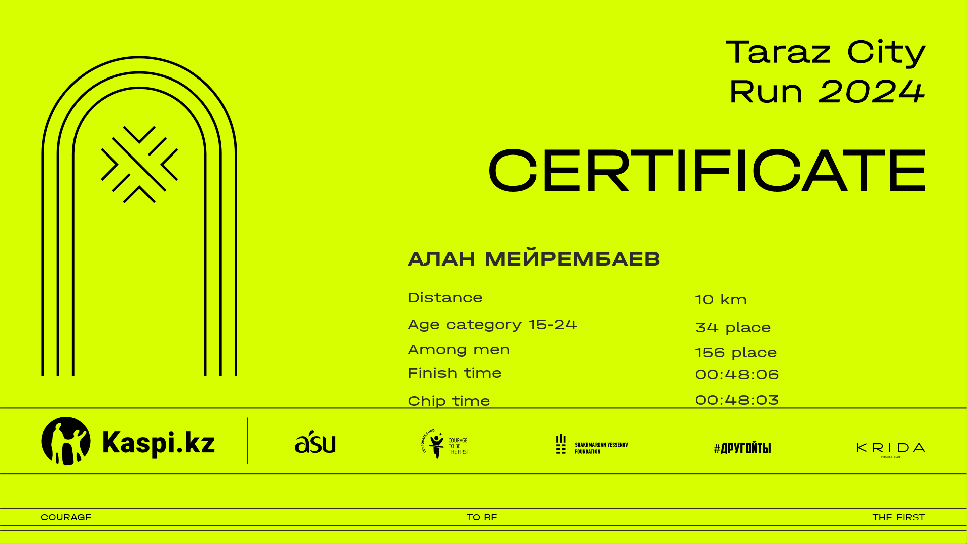 | 195 | MEIIRBEK KANATULY | ![]() | Taraz | 440 | 00:12:08.00 | 00:24:09.80 | 00:36:46.40 | 00:48:49.20 | 00:48:40.90 | Download |
