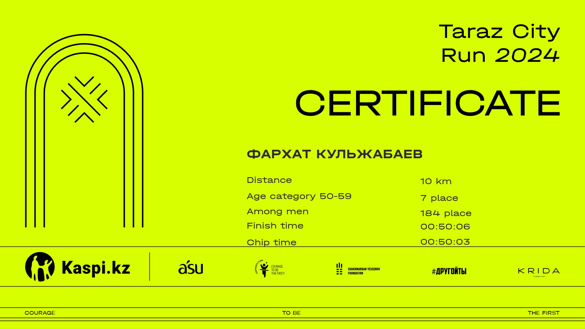 | 216 | Фархат Кульжабаев | ![]() | Тараз | 2029 | 00:12:12.70 | 00:25:00.50 | 00:37:35.80 | 00:50:06.70 | 00:50:03.80 | Download |
