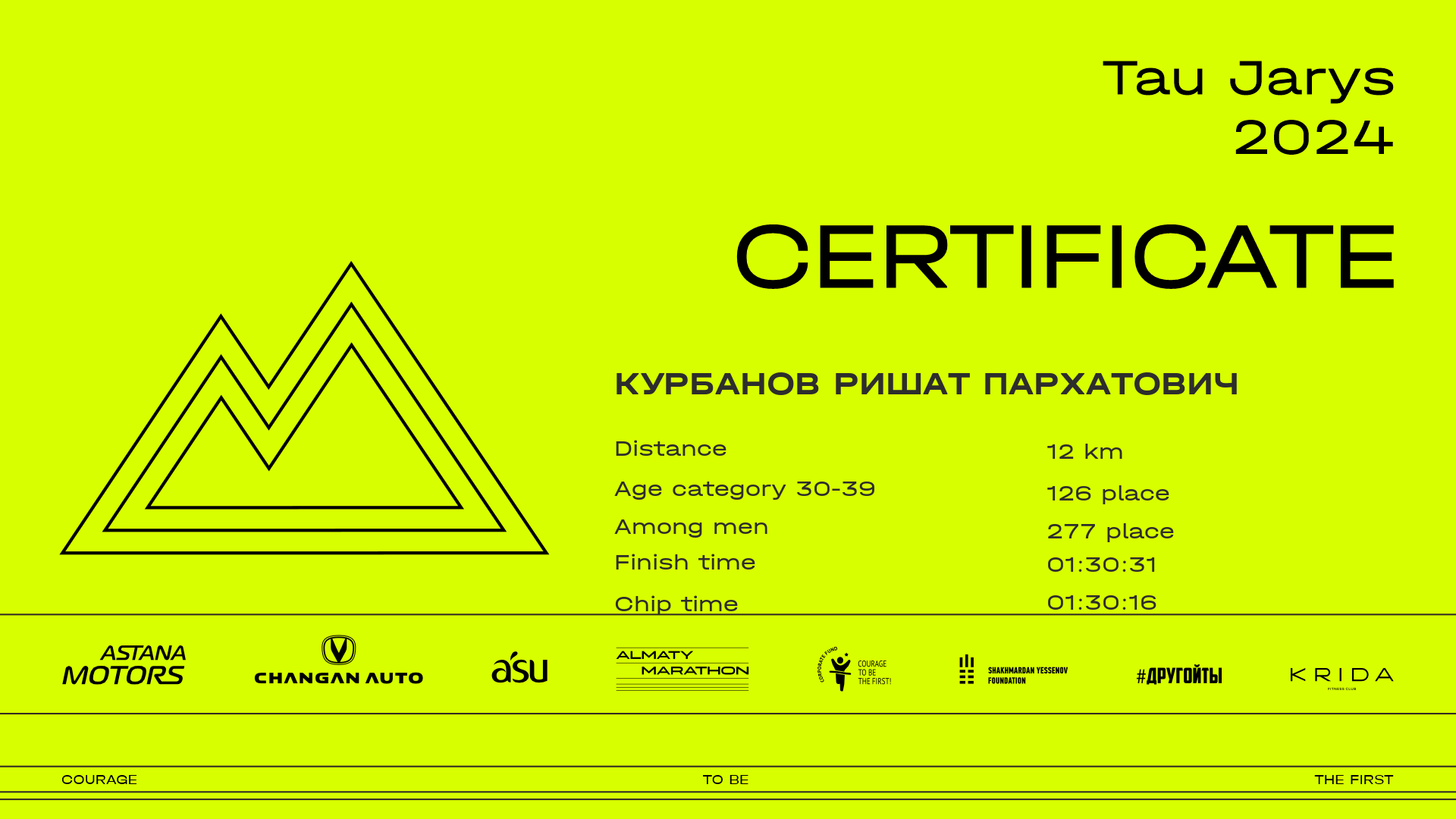 | 346 | Темирлан Алихан | ![]() | Алматы | 440 | 00:11:55.72 | 00:32:14.12 | 01:00:35.99 | 01:19:32.58 | 01:32:59.36 | 01:32:51.77 | Download |