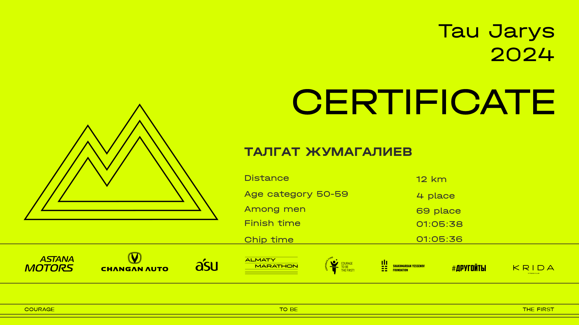| 64 | Тимур Туркпенов | ![]() | Алматы | 360 | 00:07:52.69 | 00:20:12.62 | 00:39:12.20 | 00:52:57.94 | 01:04:06.18 | 01:04:01.58 | Download |