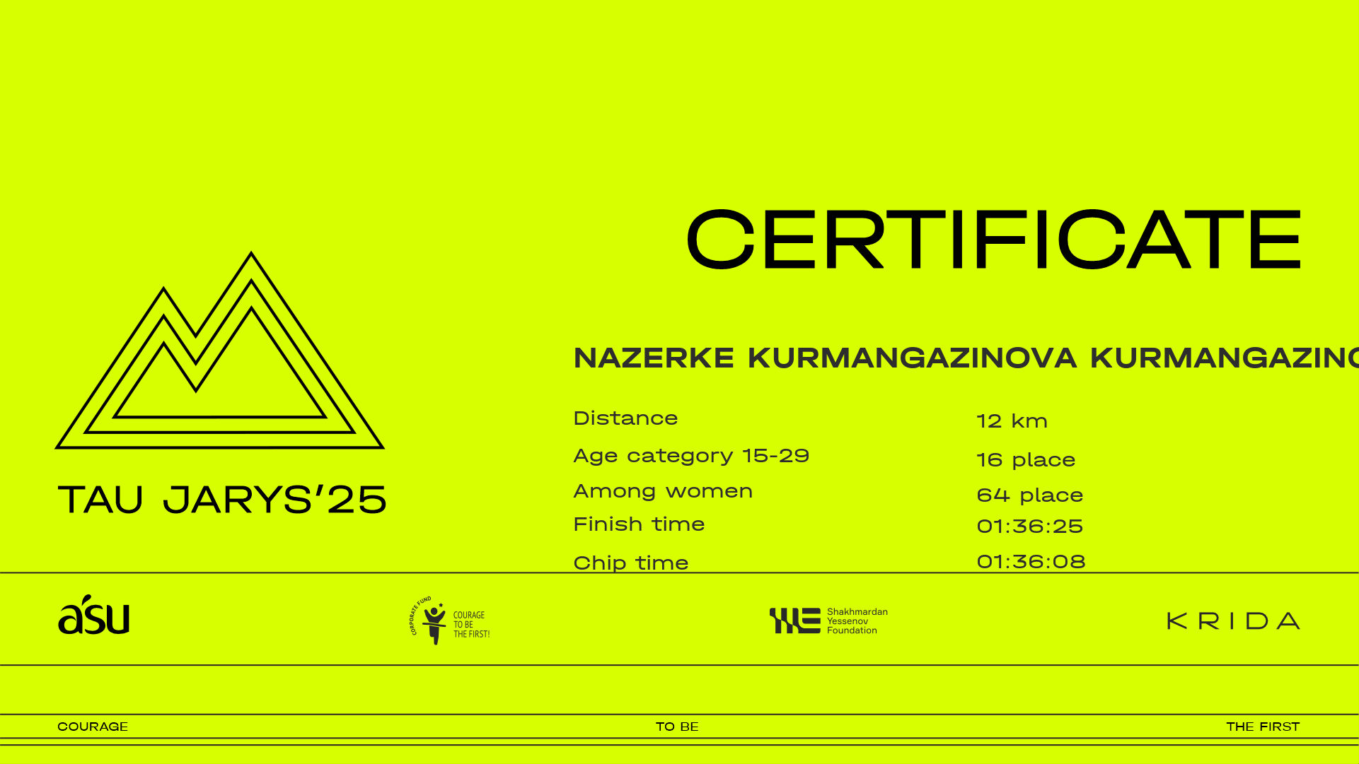 | 390 | Зарина Семенеева | ![]() | Алматы | 211 | 00:12:29.50 | 00:30:19.40 | 00:39:25.10 | 01:00:22.70 | 01:21:17.90 | 01:31:07.50 | 01:40:05.70 | 01:39:51.50 | Download |