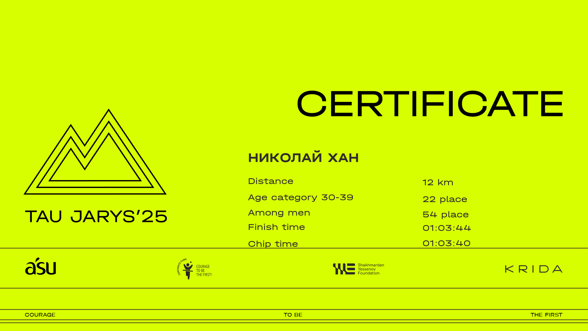 | 65 | Серик Конкин | ![]() | Алматы | 475 | 00:08:21.80 | 00:20:50.80 | 00:27:21.20 | 00:40:57.30 | 00:53:37.10 | 01:00:00.40 | 01:05:17.00 | 01:05:06.70 | Download |