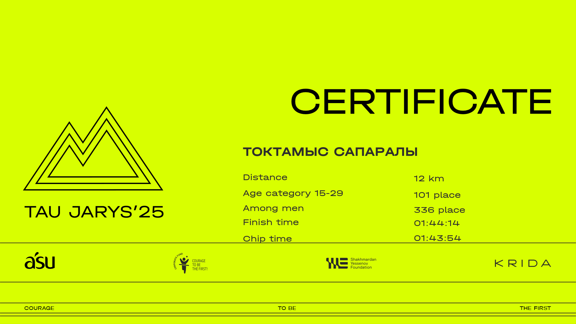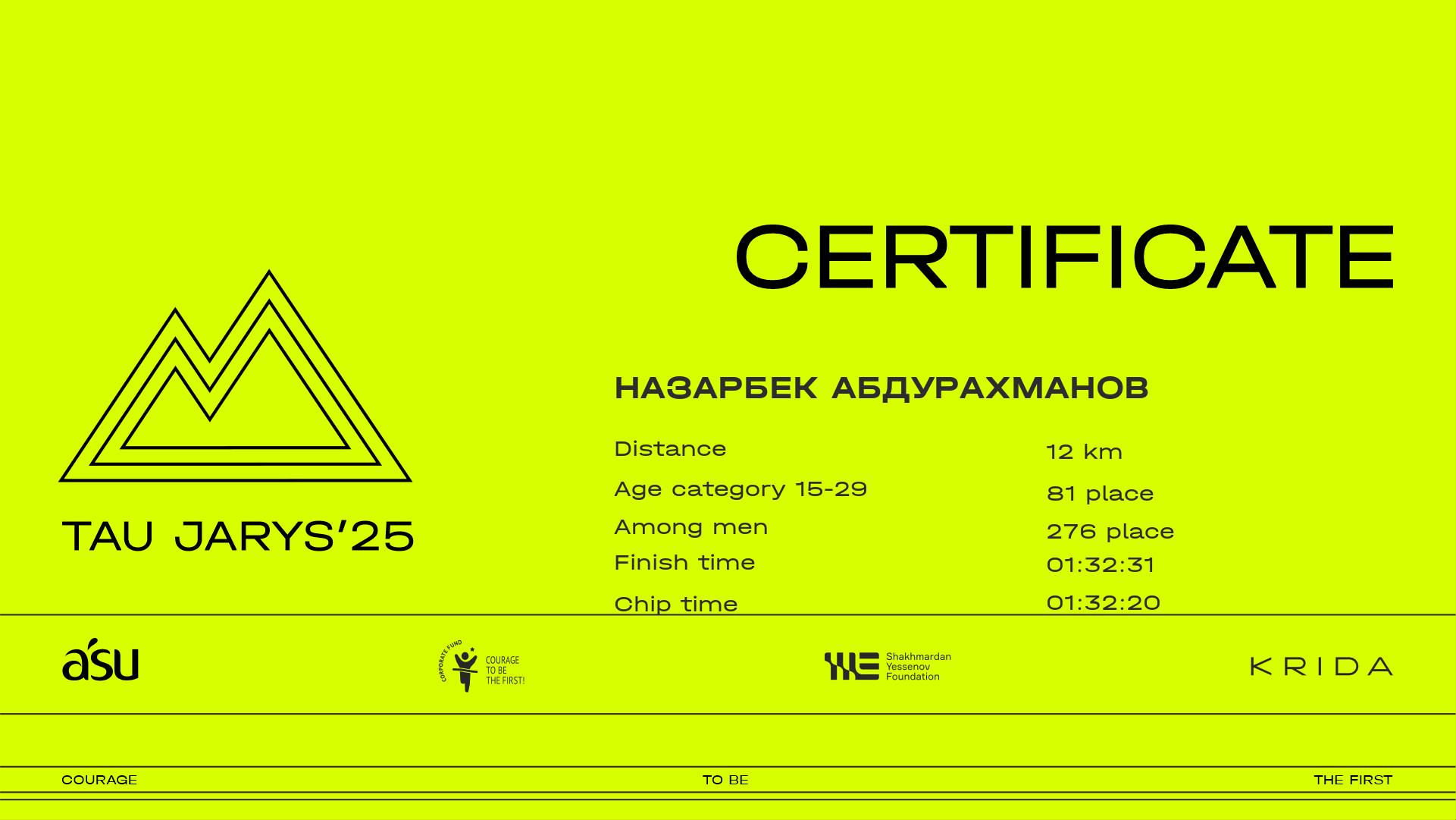 | 258 | Zhuman Temirlan | ![]() | Алматы | 401 | 00:11:41.70 | 00:26:46.90 | 00:34:33.20 | 00:53:04.50 | 01:10:07.90 | 01:17:58.70 | 01:25:18.00 | 01:25:15.30 | Download |