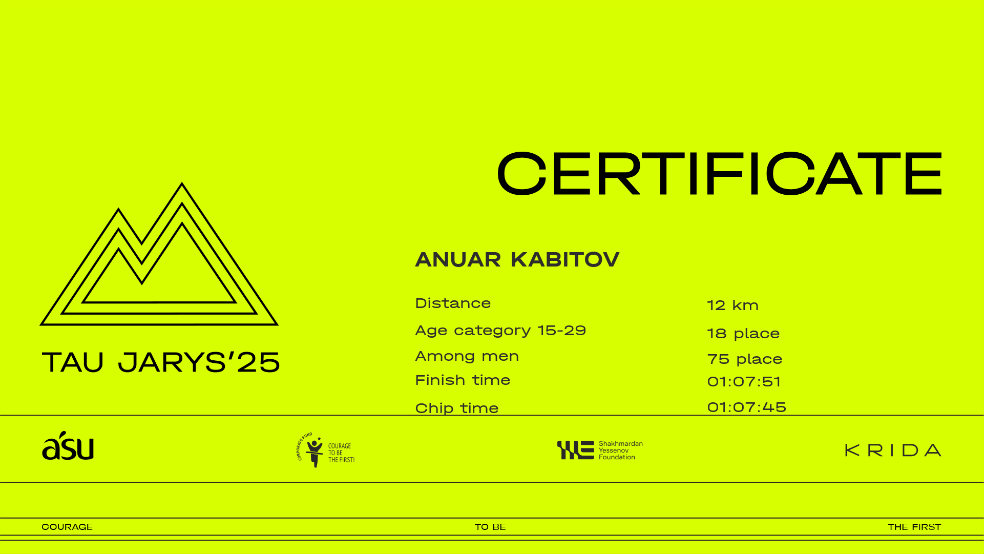 | 82 | Нұрлыхан Абдрахман | ![]() | Алматы | 352 | 00:07:40.30 | 00:20:03.40 | 00:27:13.40 | 00:42:14.80 | 00:55:42.80 | 01:02:24.10 | 01:07:50.80 | 01:07:34.40 | Download |