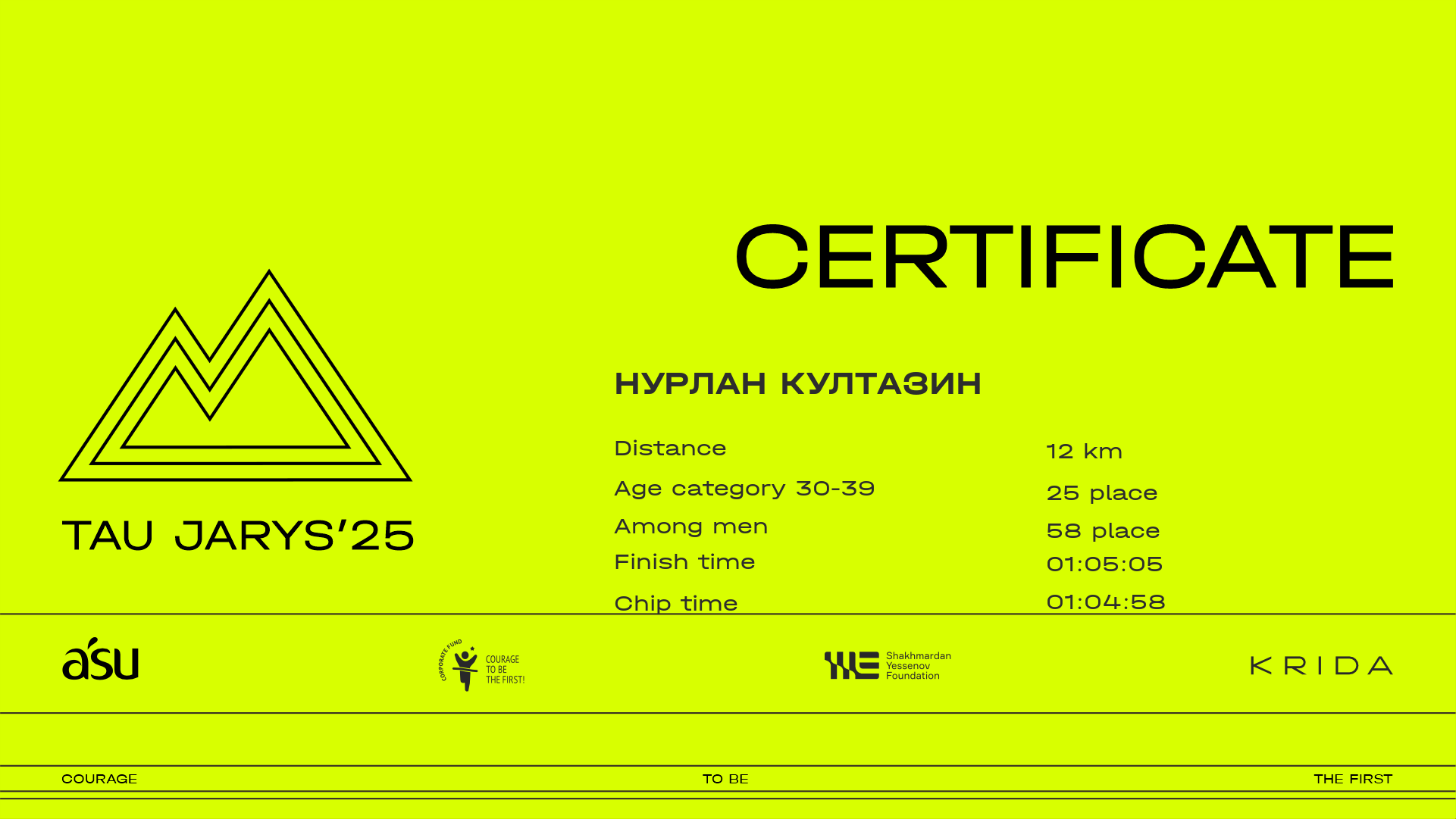 | 65 | Серик Конкин | ![]() | Алматы | 475 | 00:08:21.80 | 00:20:50.80 | 00:27:21.20 | 00:40:57.30 | 00:53:37.10 | 01:00:00.40 | 01:05:17.00 | 01:05:06.70 | Download |