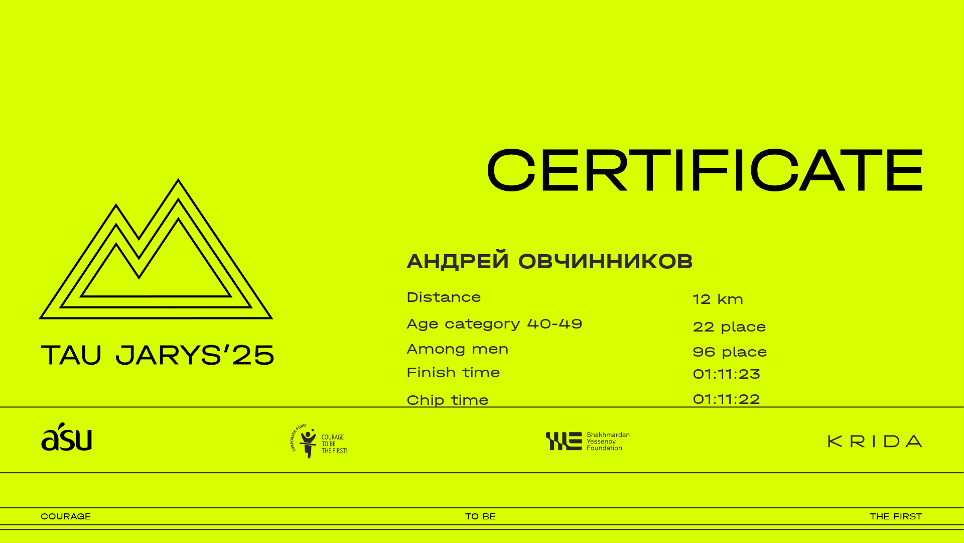 | 106 | Андрей Овчинников | ![]() | Almaty | 122 | 00:07:26.30 | 00:21:01.30 | 00:27:58.50 | 00:43:43.30 | 00:58:10.20 | 01:05:22.60 | 01:11:23.50 | 01:11:22.20 | Download |