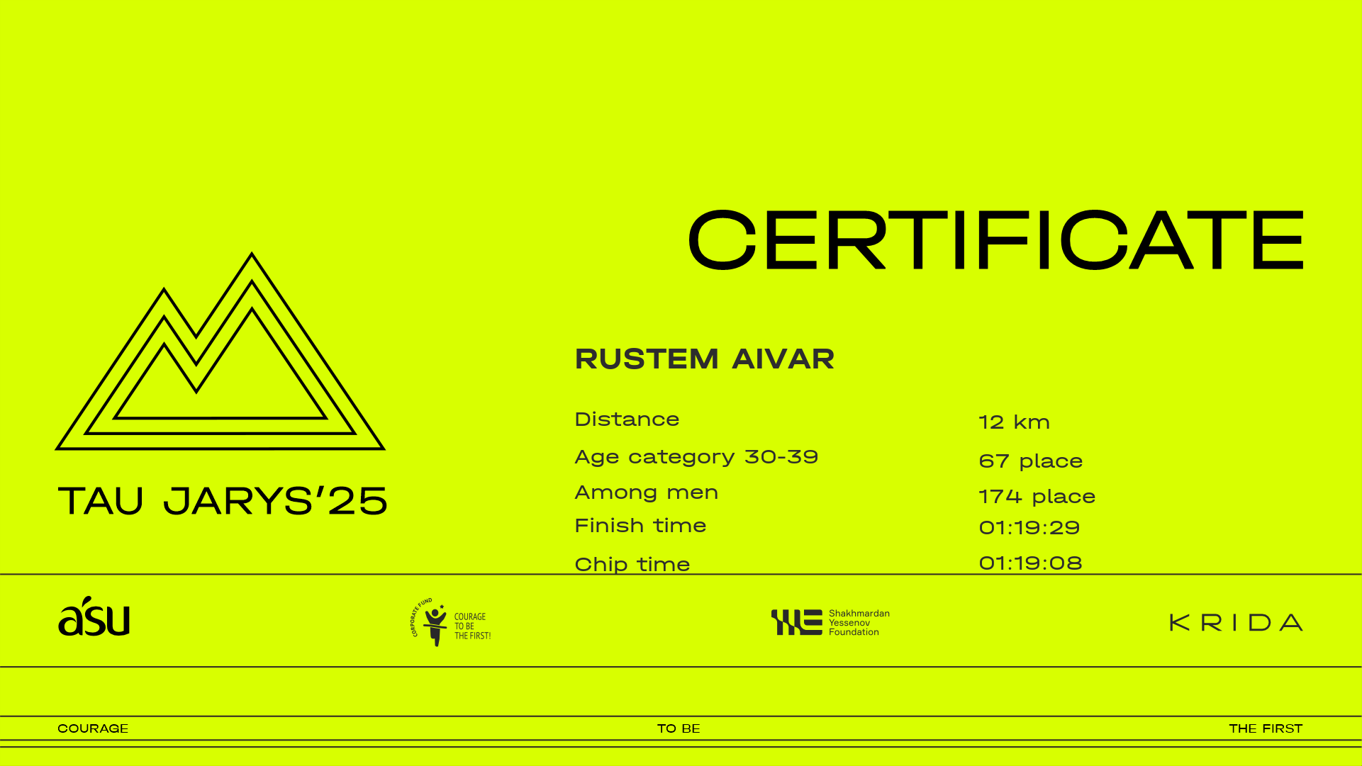 | 191 | Сұңғат Құрмашев | ![]() | Алматы | 517 | 00:08:09.10 | 00:22:32.40 | 00:30:23.70 | 00:48:17.10 | 01:04:26.80 | 01:12:23.90 | 01:18:58.30 | 01:18:53.50 | Download |