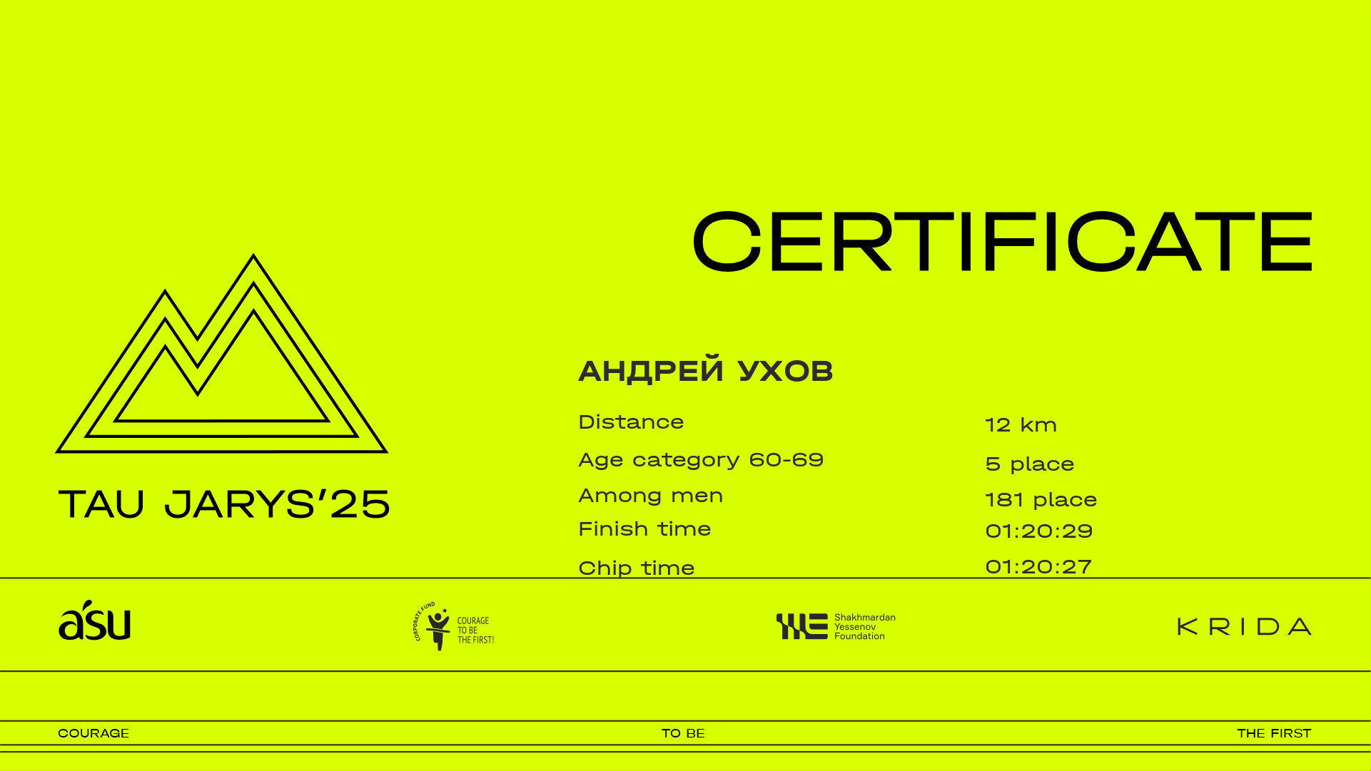| 106 | Андрей Овчинников | ![]() | Almaty | 122 | 00:07:26.30 | 00:21:01.30 | 00:27:58.50 | 00:43:43.30 | 00:58:10.20 | 01:05:22.60 | 01:11:23.50 | 01:11:22.20 | Download |